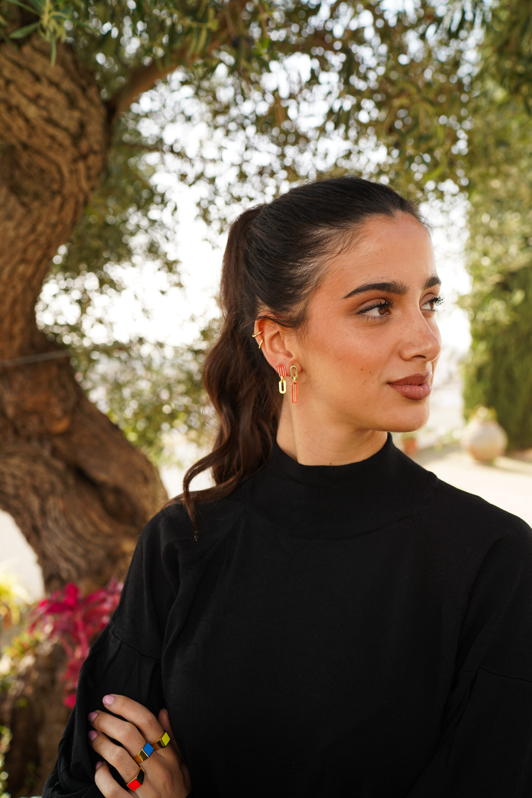 Pendientes en plata de ley chapado en oro con tres eslabones colgando, siendo el primero de esmalte color rosa flúor.