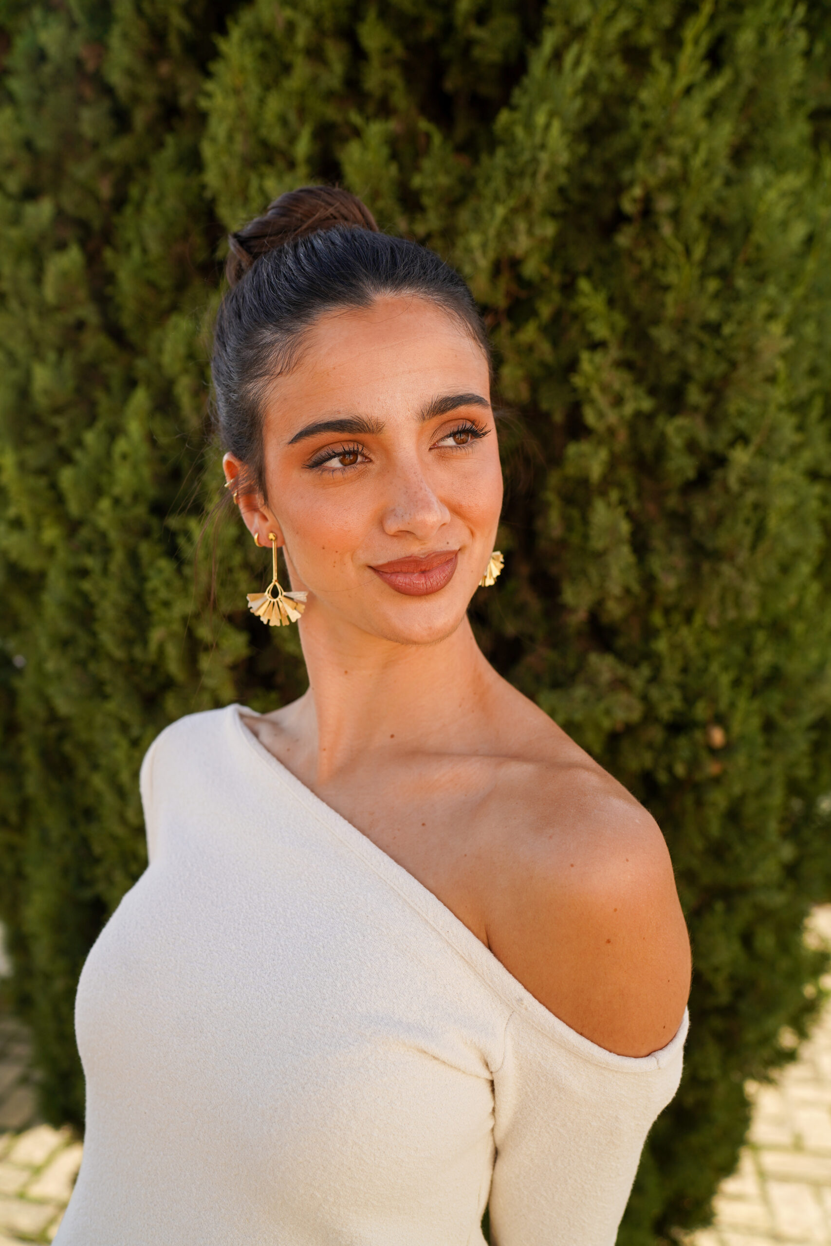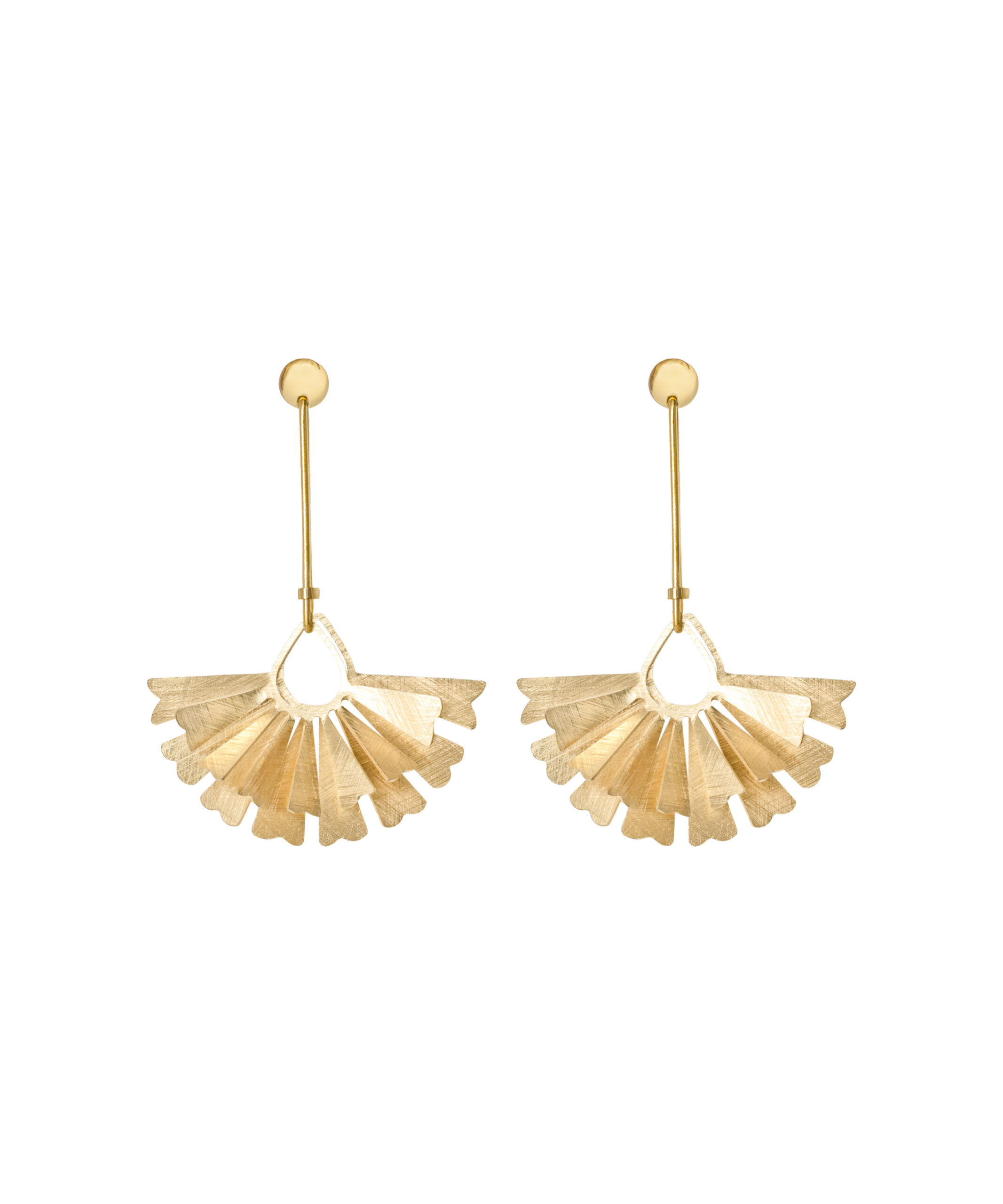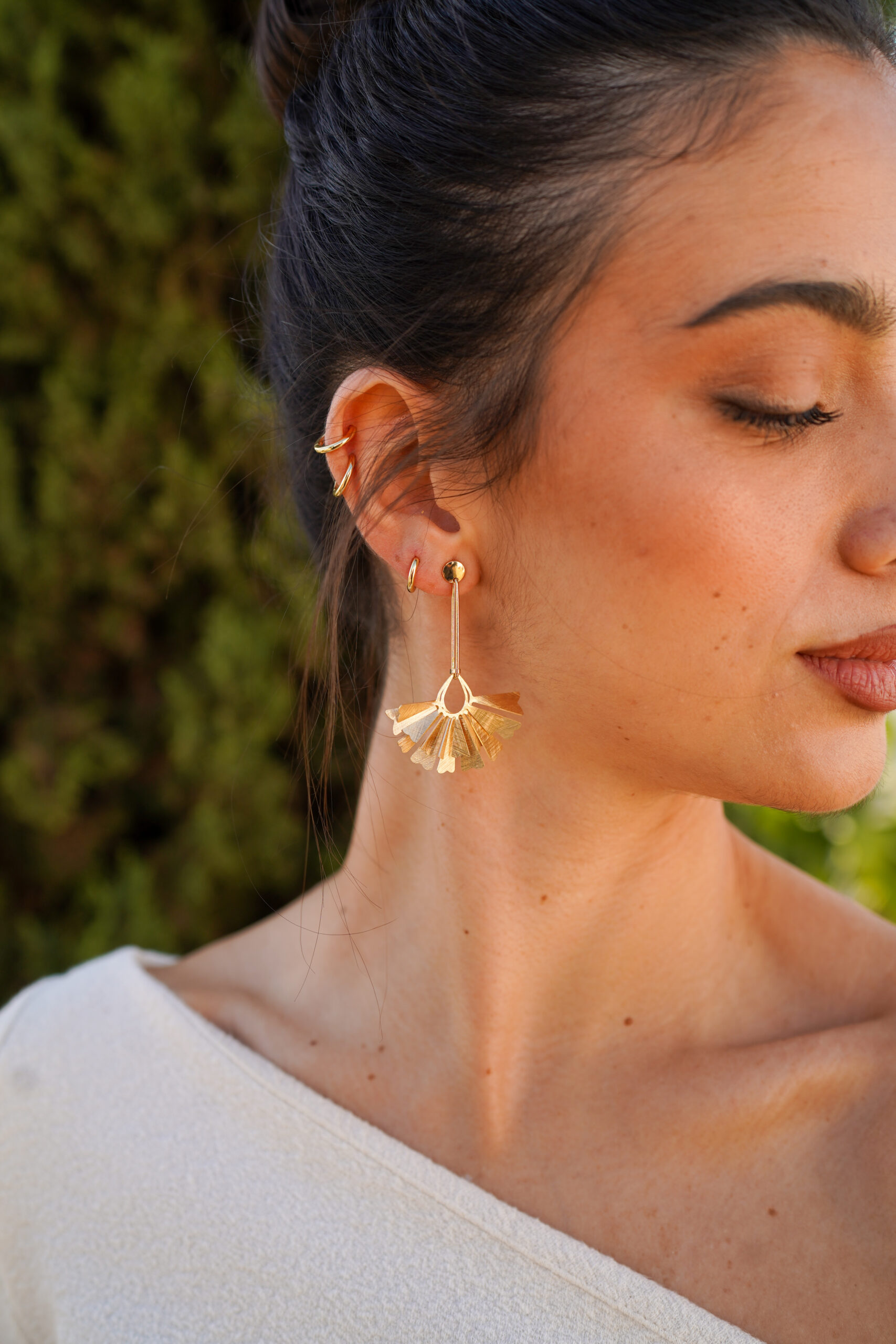Pendientes colgantes, en plata de ley chapada en oro, con un diseño inspirado en abanicos. La pieza combina un acabado texturizado en los abanicos con líneas elegantes, creando una joya ligera y sofisticada que aporta movimiento y estilo a cualquier look. Perfectos para ocasiones especiales o para añadir un toque de distinción al día a día.