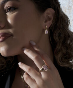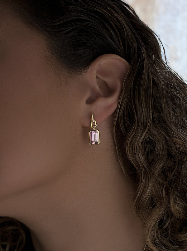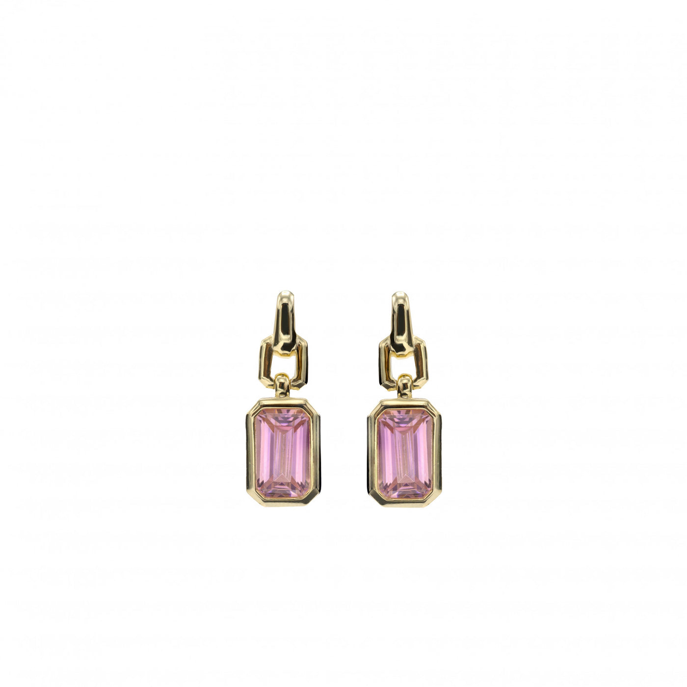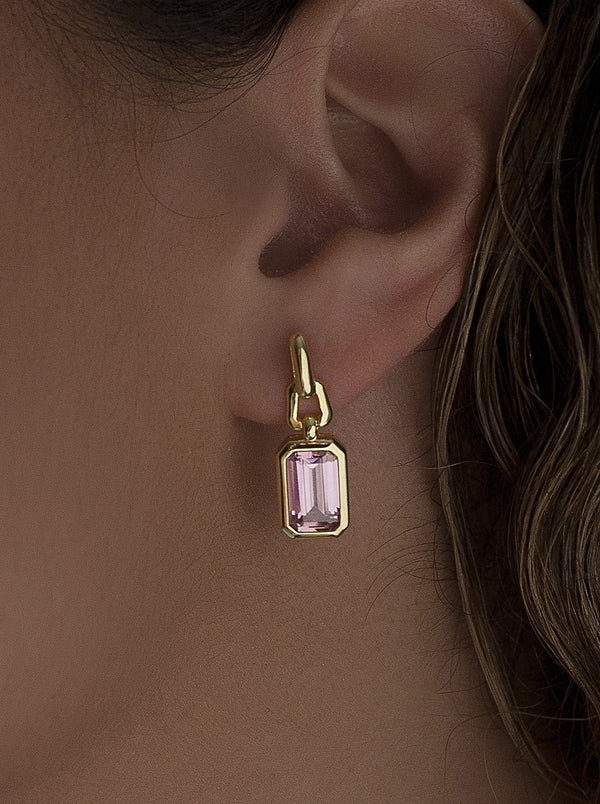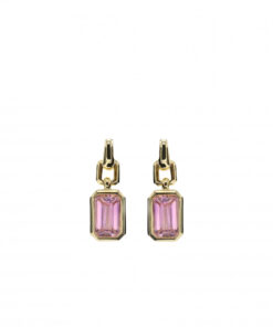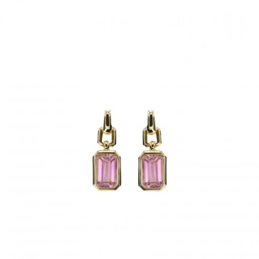 Pendientes colgantes, en plata de ley chapada en oro, con un diseño elegante y geométrico que destaca por su simplicidad y sofisticación. Cada pendiente cuenta con una gema rectangular en tono rosa de corte facetado, enmarcada por una estructura minimalista que resalta su brillo y profundidad. La montura, compuesta por eslabones geométricos, aporta un toque contemporáneo, ideal para complementar cualquier estilo con distinción.