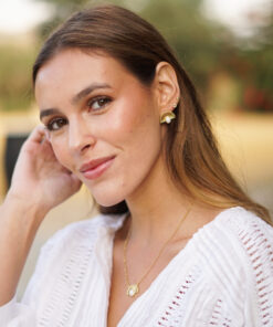 Pendientes en plata de ley chapados en oro en forma de semicírculo con una piedra luna en el centro.