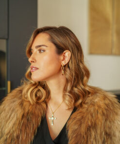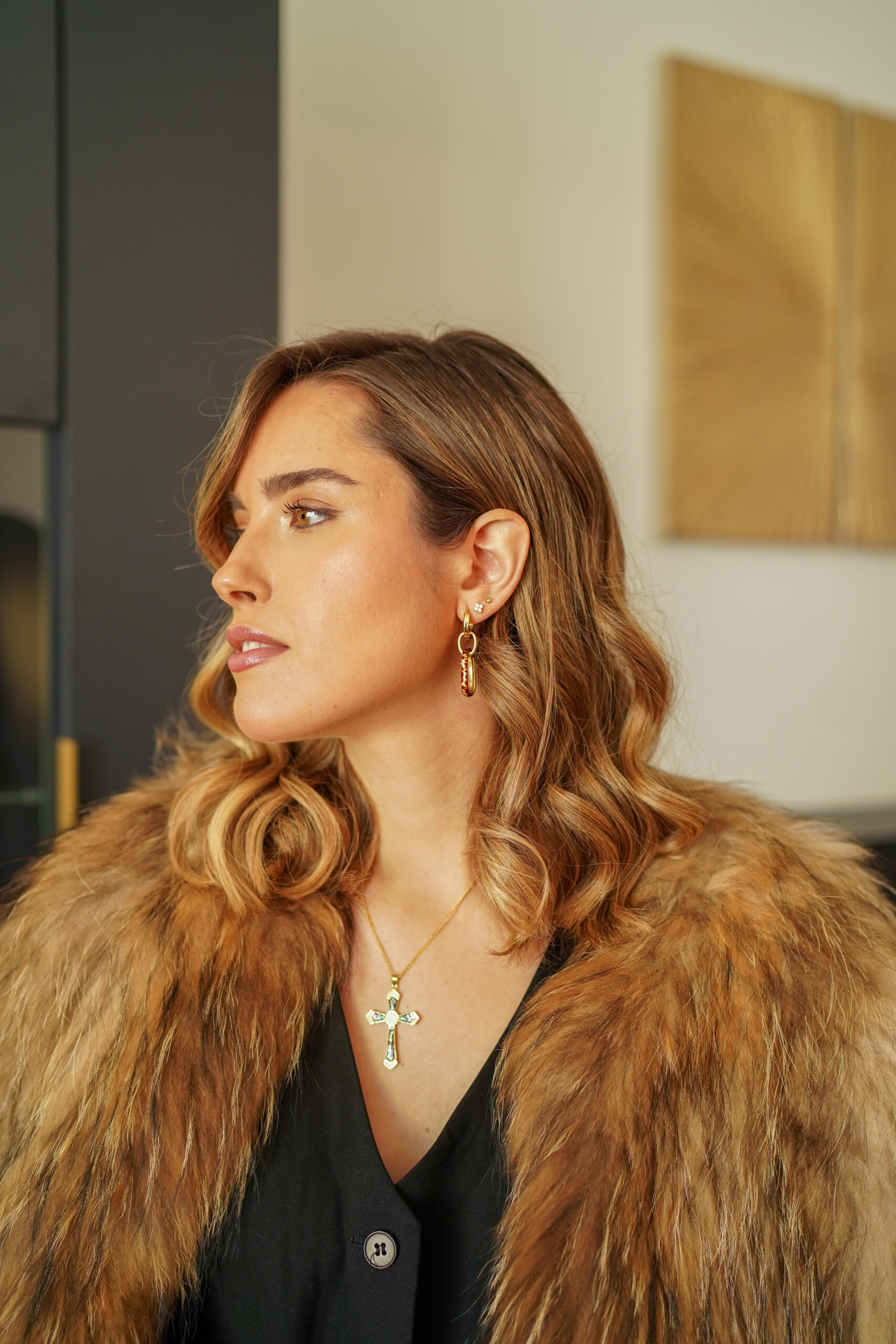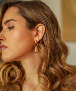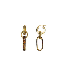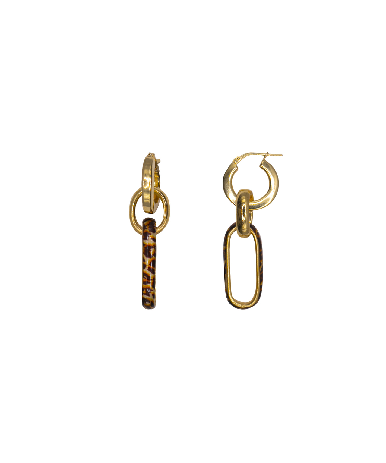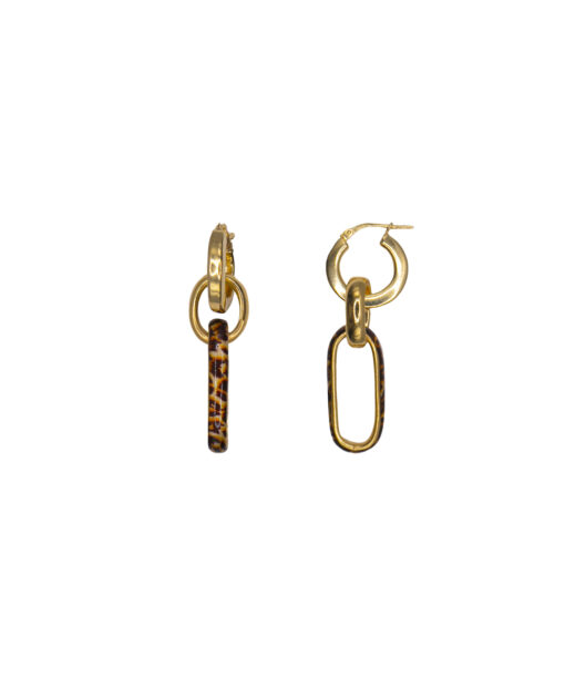 Pendientes aros en plata de ley chapados en oro con eslabones, uno de ellos de esmalte tonos leopardo.