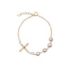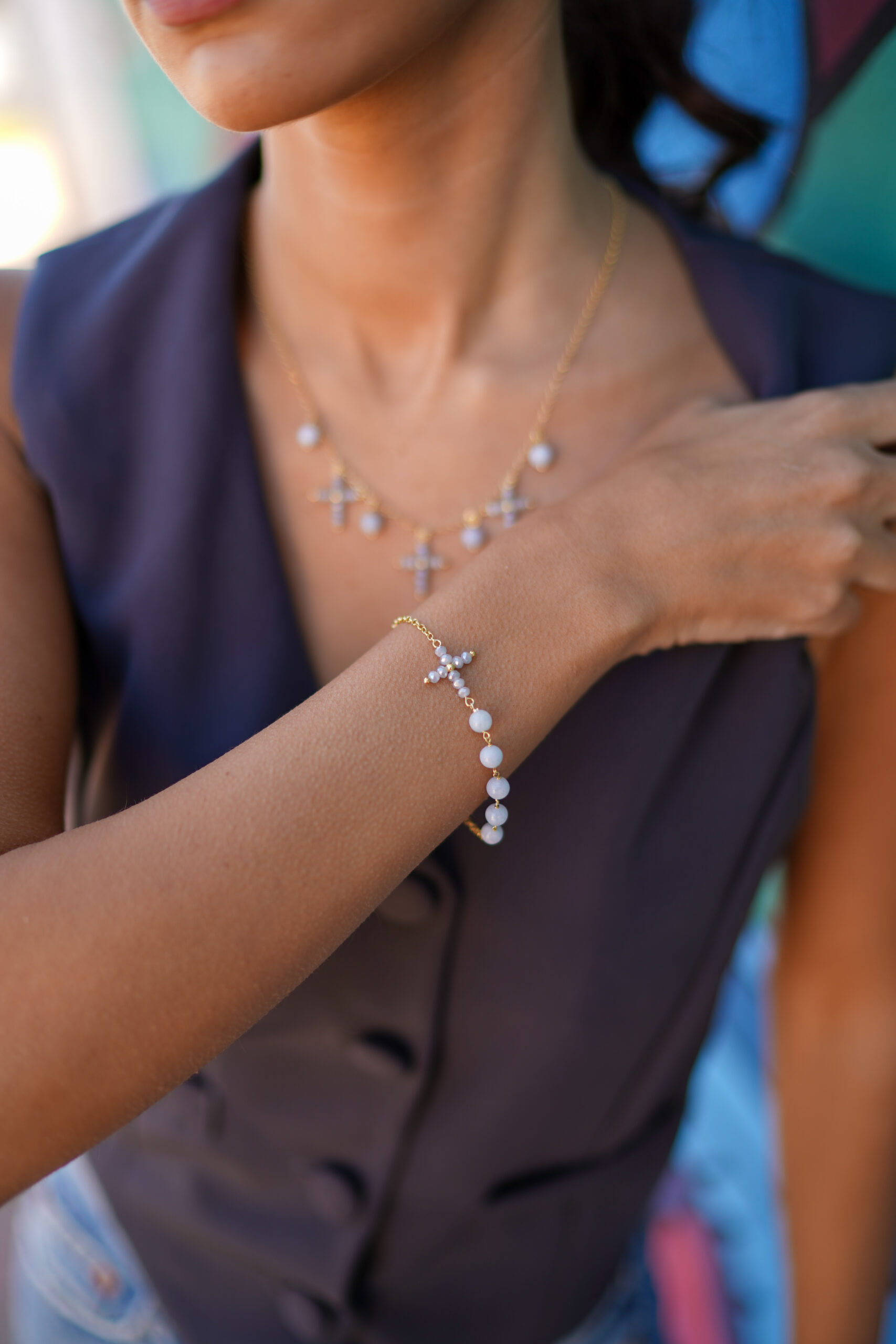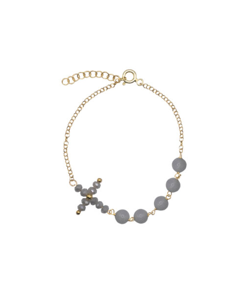 Pulsera en plata de ley chapado en oro con cinco bolas y una cruz de agua marina natural.
