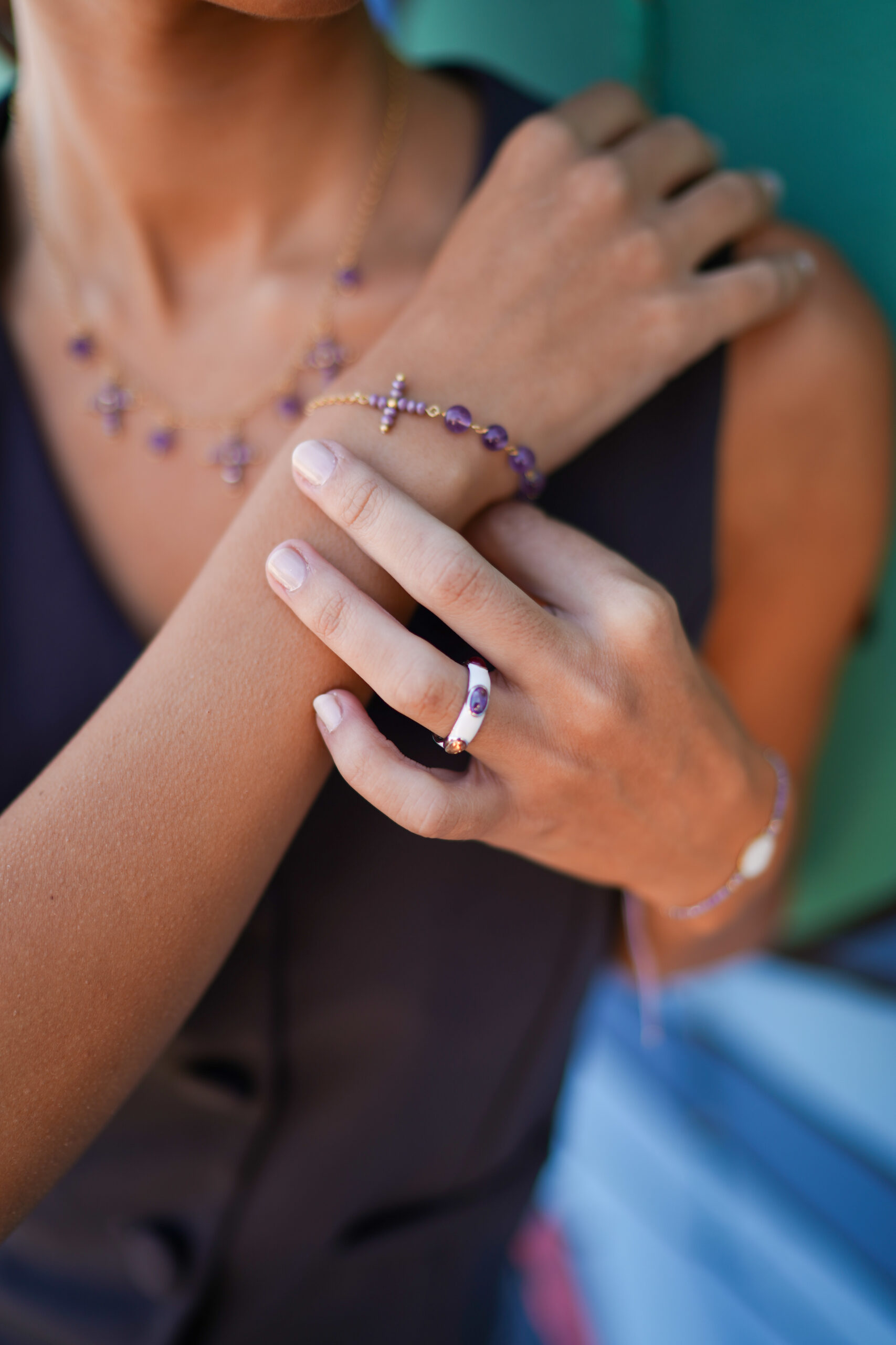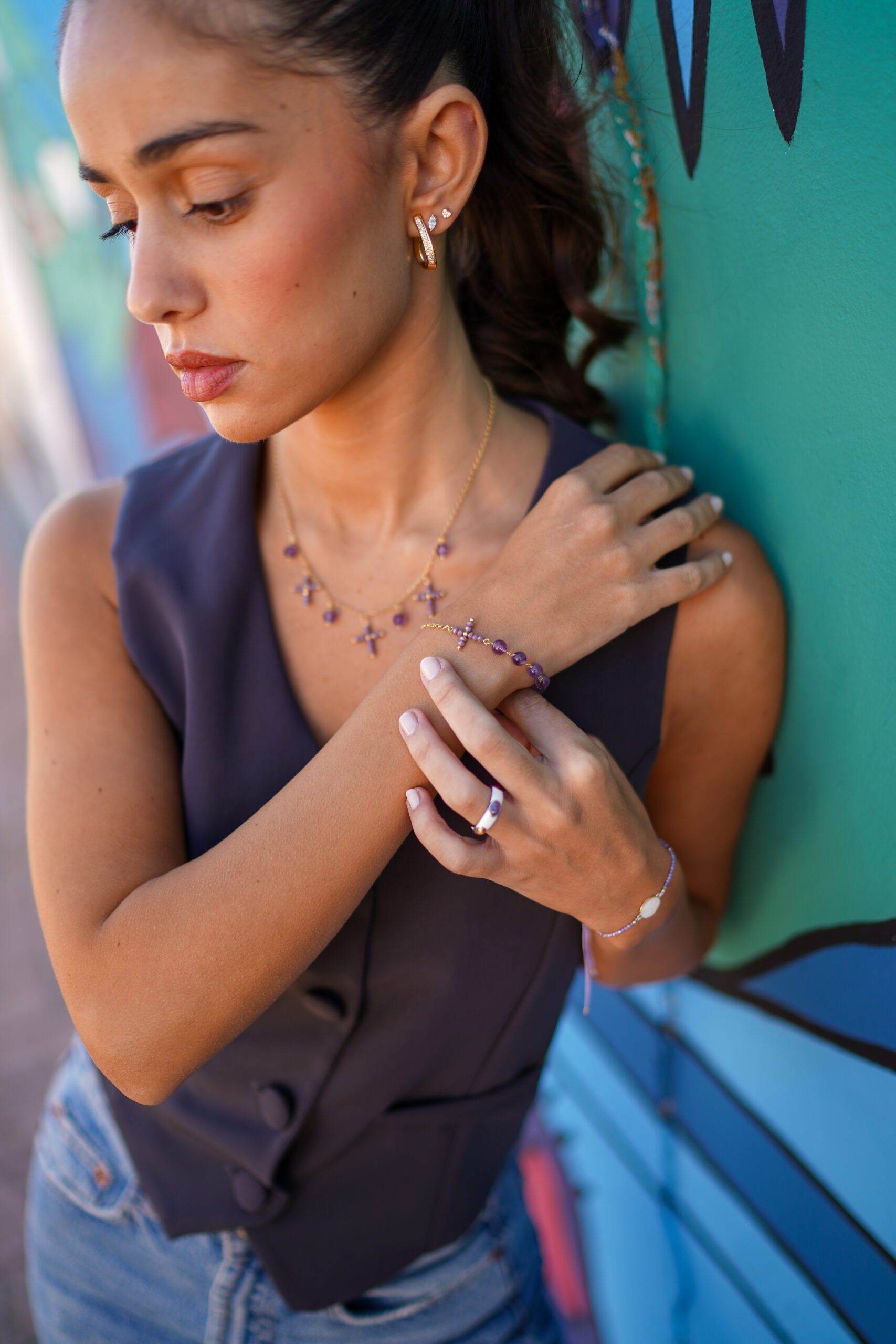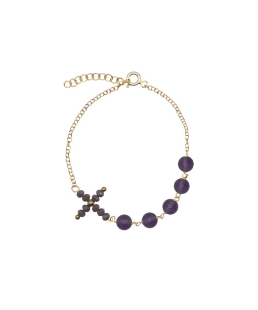 Pulsera en plata de ley chapado en oro con cinco bolas y una cruz de amatistas naturales