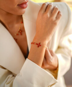 Pulsera en plata de ley chapado en oro con cinco bolas y una cruz de coral natural.