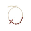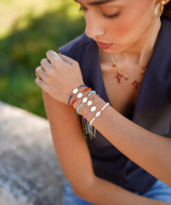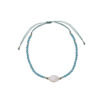Pulsera en plata de ley chapado en oro y macramé con óvalo de madreperla tallada en el que se representa a la Virgen Milagrosa y bolitas de amatistas naturales por toda la pulsera