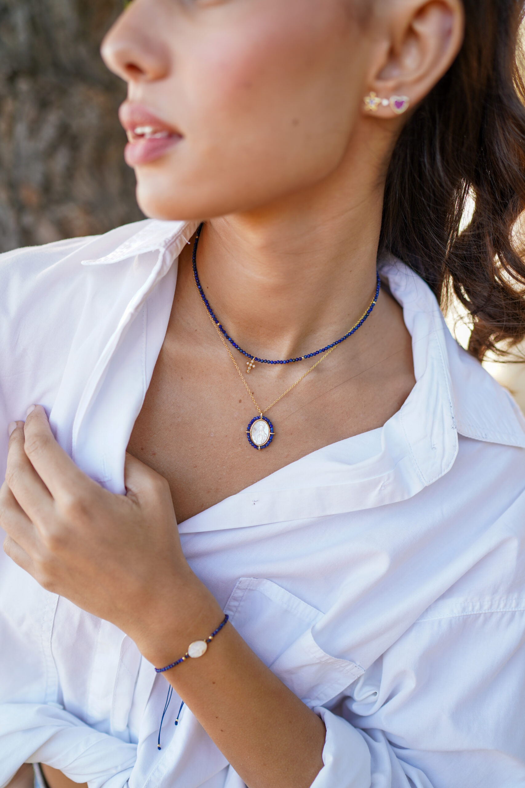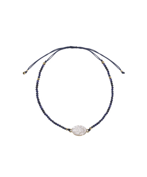 Pulsera en plata de ley chapado en oro y macramé con óvalo de madreperla tallada en el que se representa a la Virgen Milagrosa y bolitas de lapislázuli natural por toda la pulsera.
