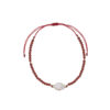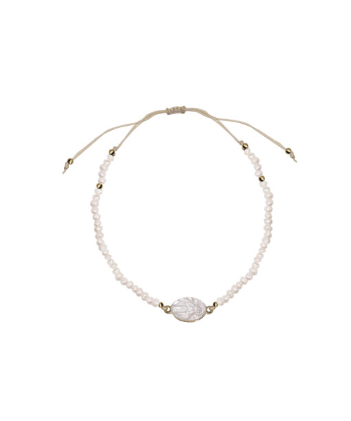 Pulsera en plata de ley chapado en oro y macramé con óvalo de madreperla tallada en el que se representa a la Virgen Milagrosa y perlas naturales por toda la pulsera.