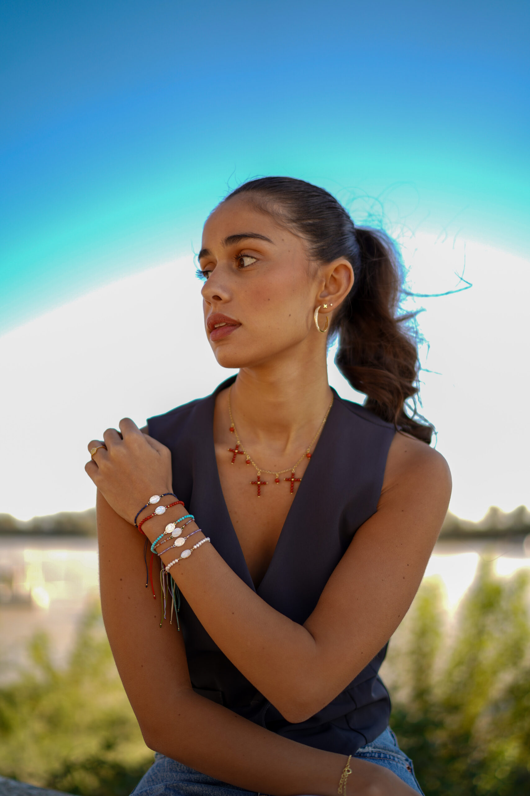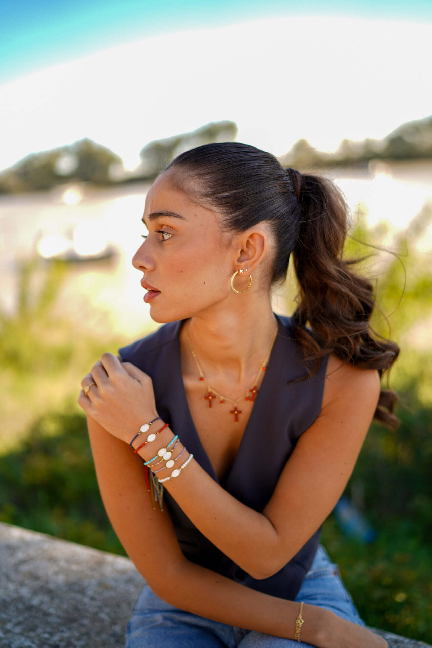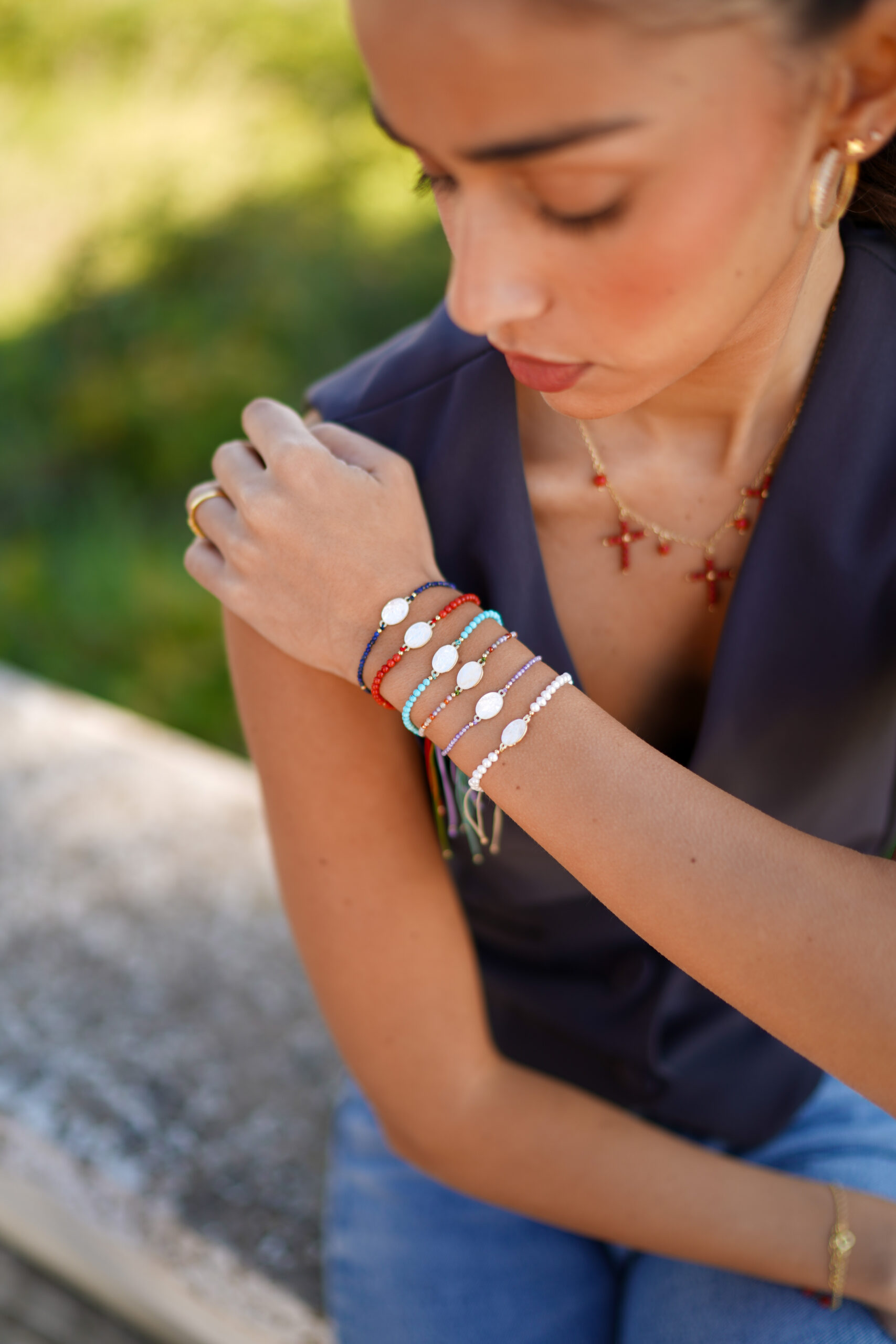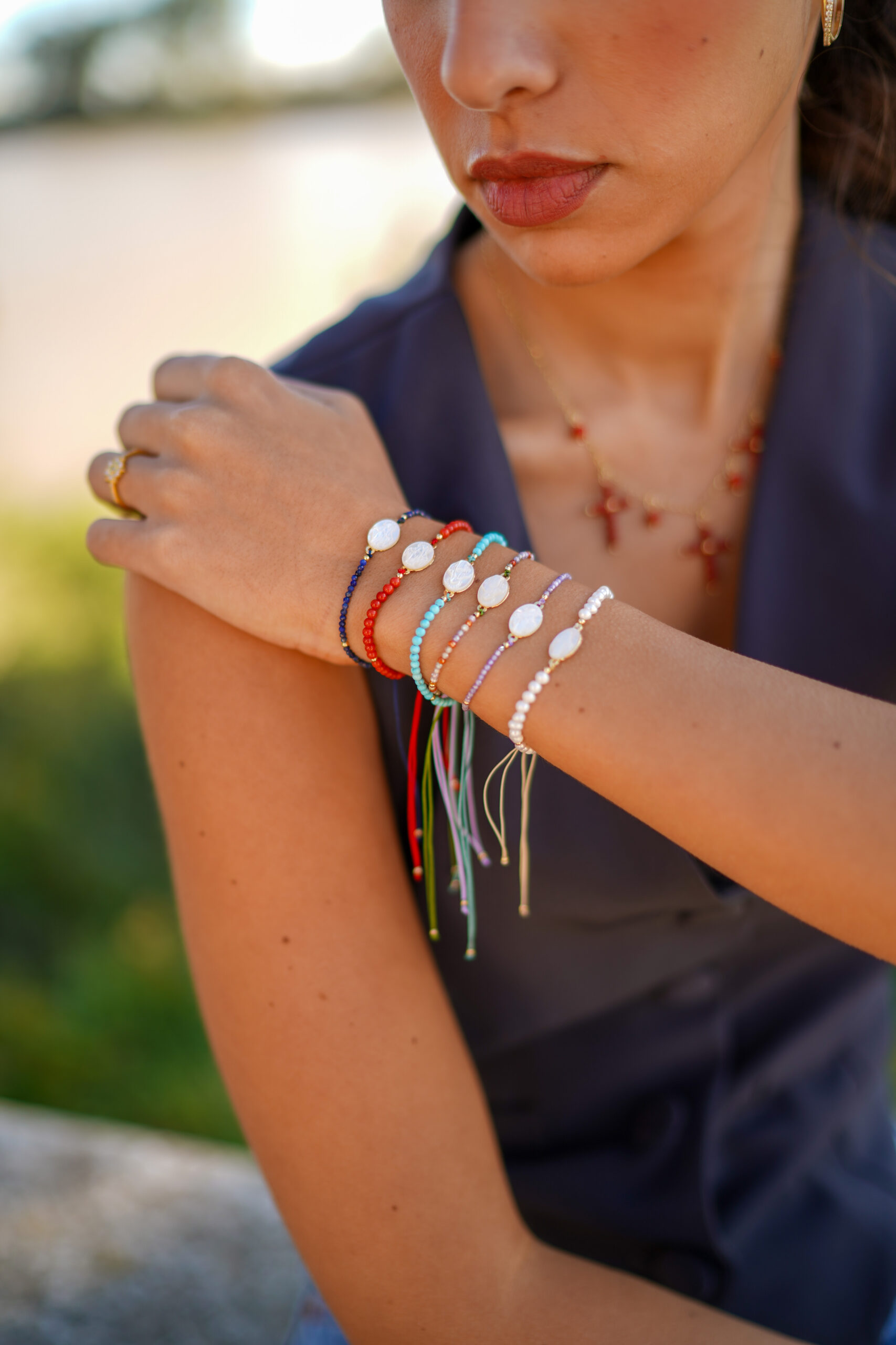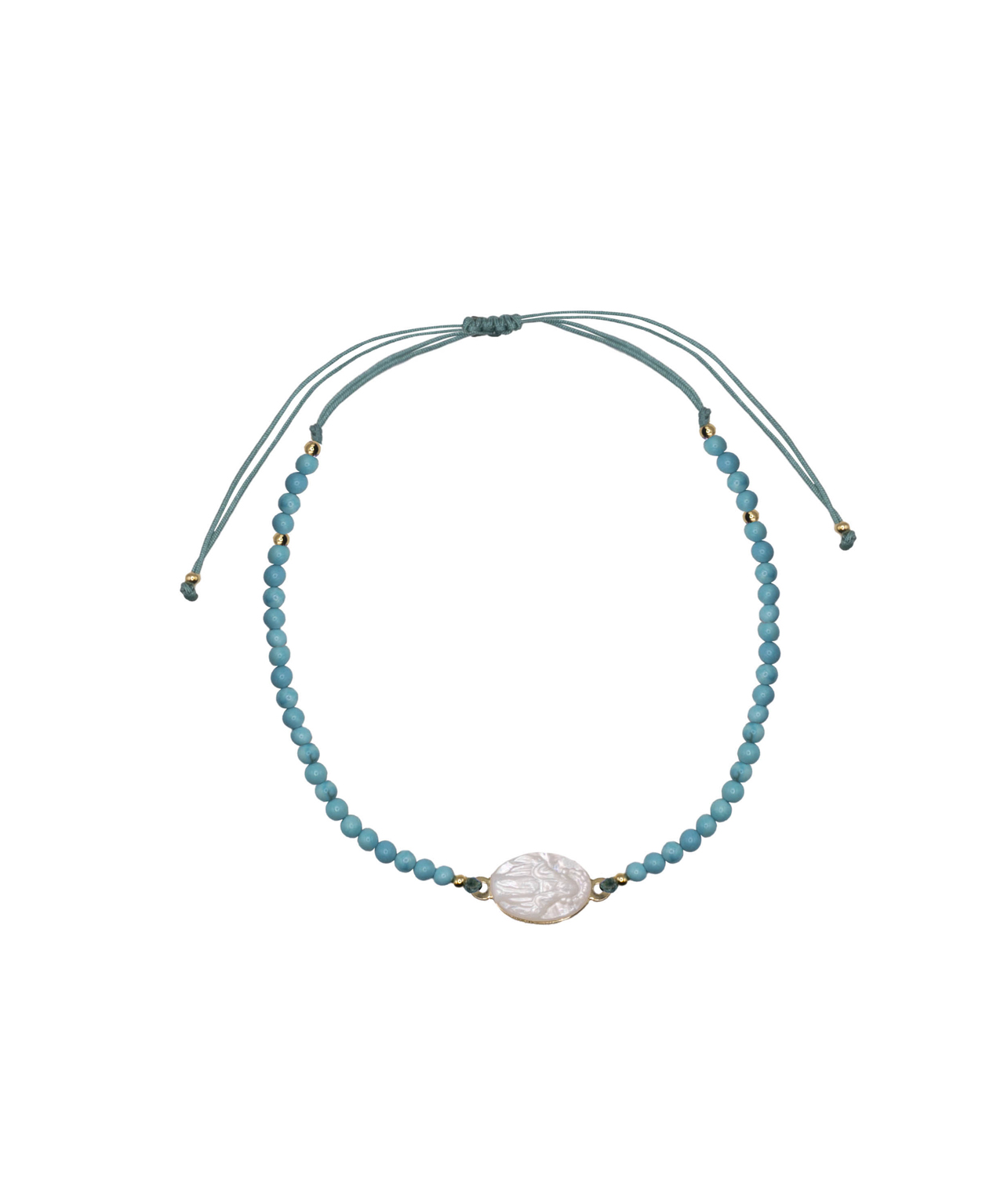 Pulsera en plata de ley chapado en oro y macramé con óvalo de madreperla tallada en el que se representa a la Virgen Milagrosa y bolitas de turquesas naturales por toda la pulsera.
