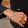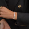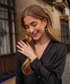 Pulsera de plata de ley chapada en oro, formado por dos finas hileras de pequeñas perlas grises cultivadas que se encuentran en un delicado nudo central. Una pieza suave, luminosa y muy femenina, ideal para elevar cualquier look con un toque clásico y atemporal.