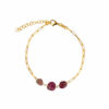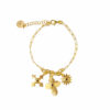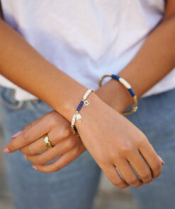 Pulsera en plata de ley chapada en oro formado por dos tipos de piedras naturales como son el nácar y lapislázuli alternándose entre ellas y separadas por charms de distintos motivos.