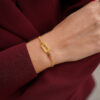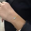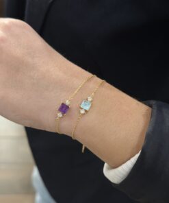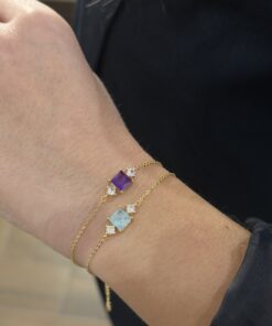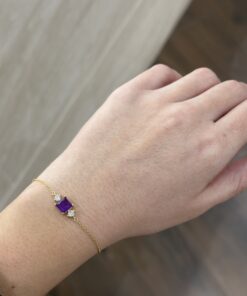 Pulsera en plata de ley chapada en oro con una piedra central de circonita en talla cuadrada de un intenso tono púrpura, acompañada a cada lado por dos circonitas blancas que aportan brillo y equilibrio al diseño. Su cadena fina y ajustable la convierte en una pieza elegante y cómoda para el día a día.