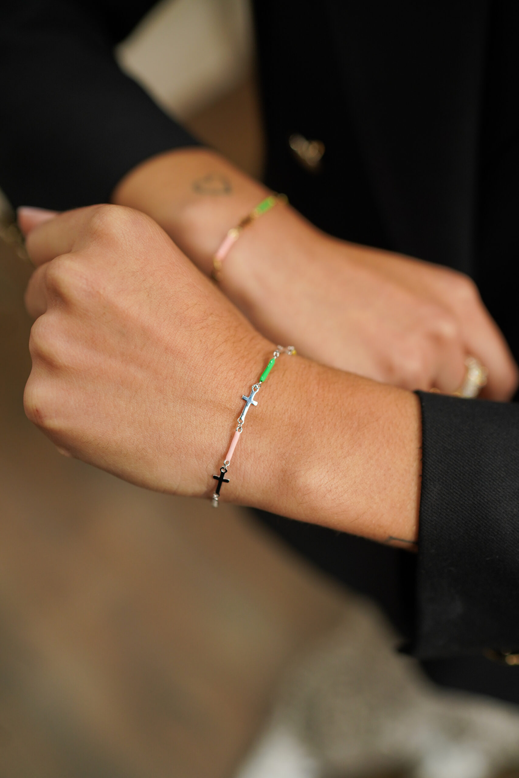 Pulsera en plata de ley con diseño lleno de color, compuesta por pequeños tubos esmaltados en tonos vibrantes —verde, turquesa, rosa, blanco y amarillo— intercalados con cruces que aportan ritmo y movimiento. Una pieza fresca, alegre y muy ligera, perfecta para dar un toque divertido a cualquier look.