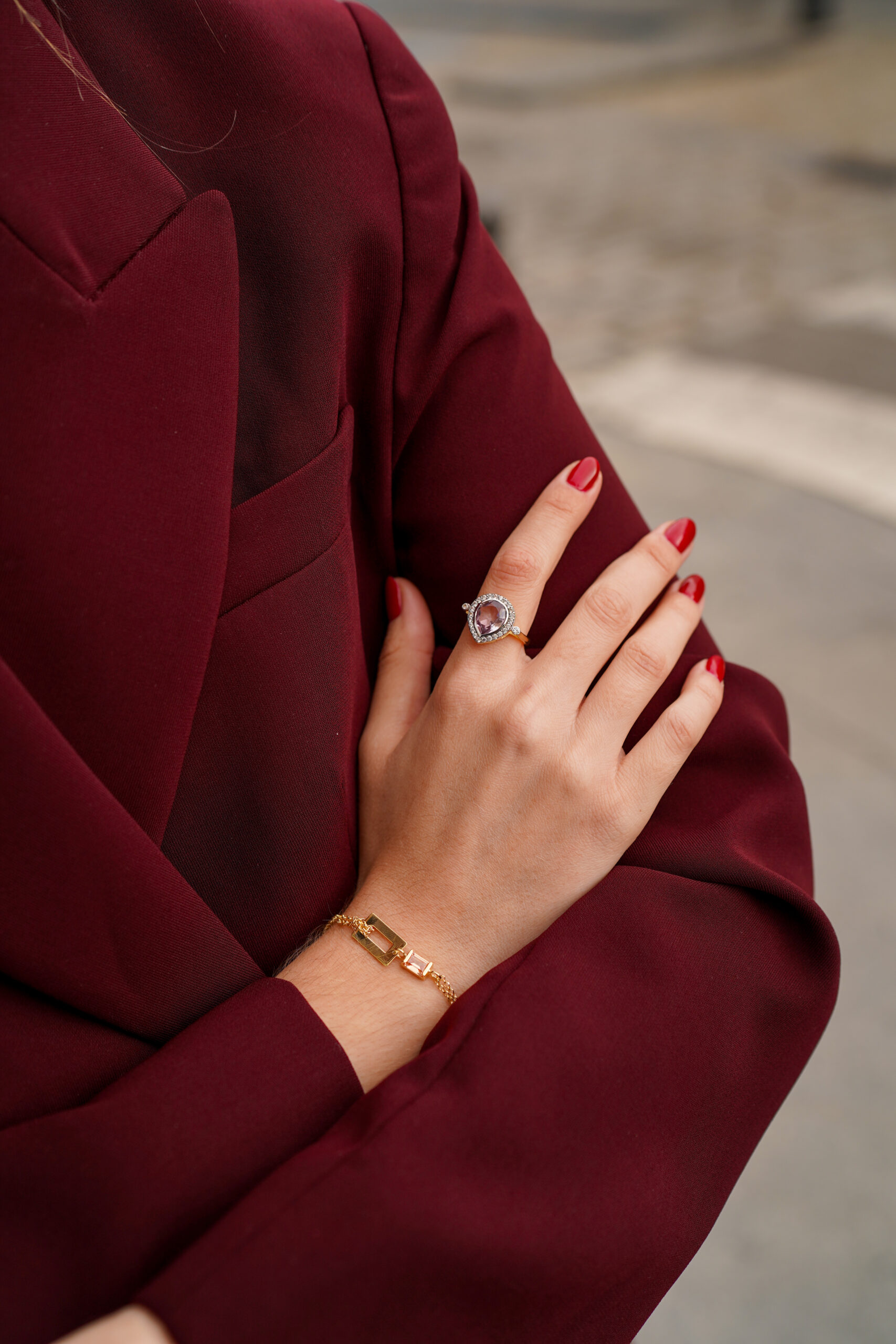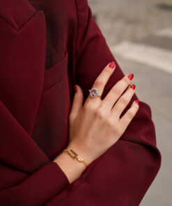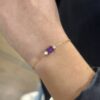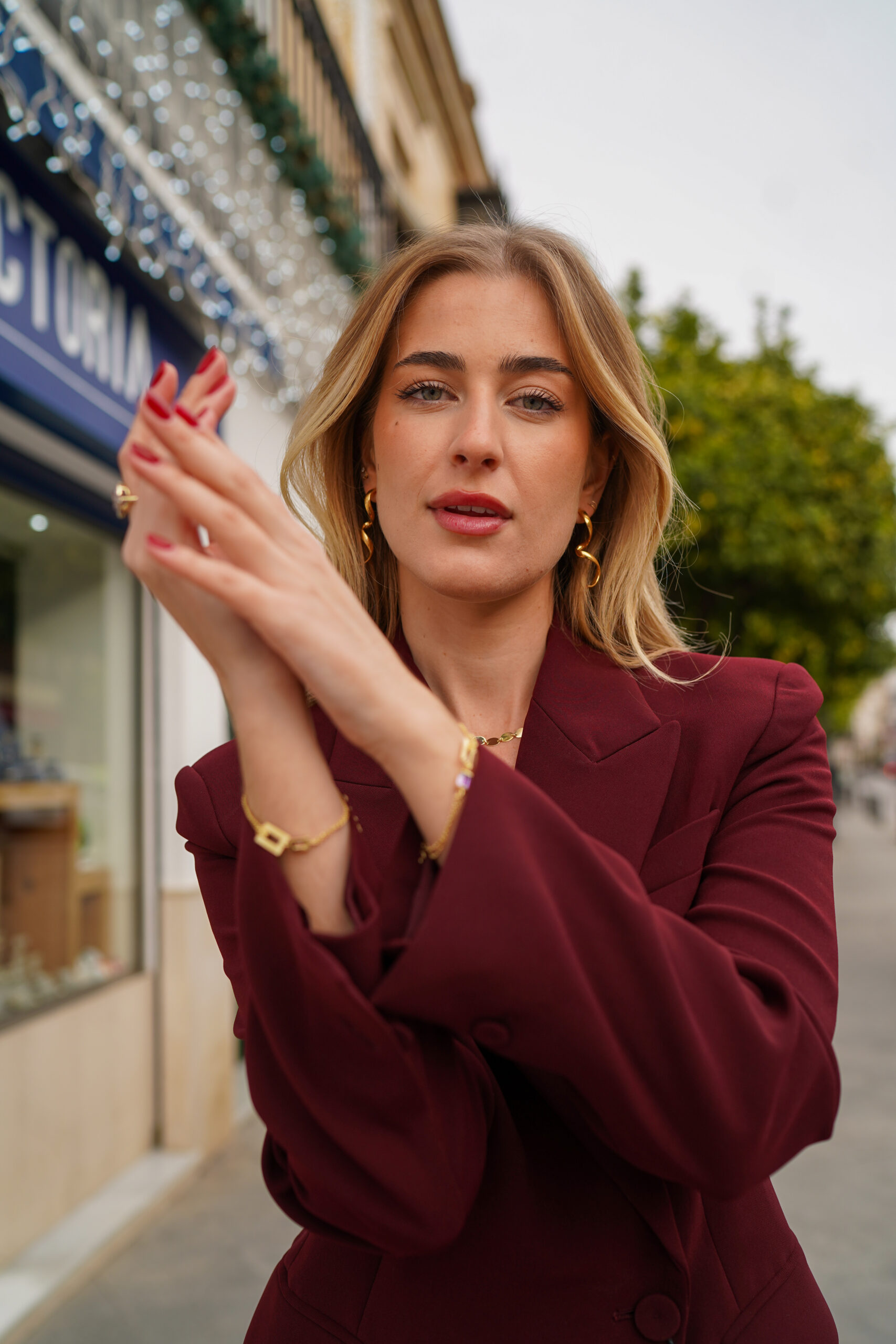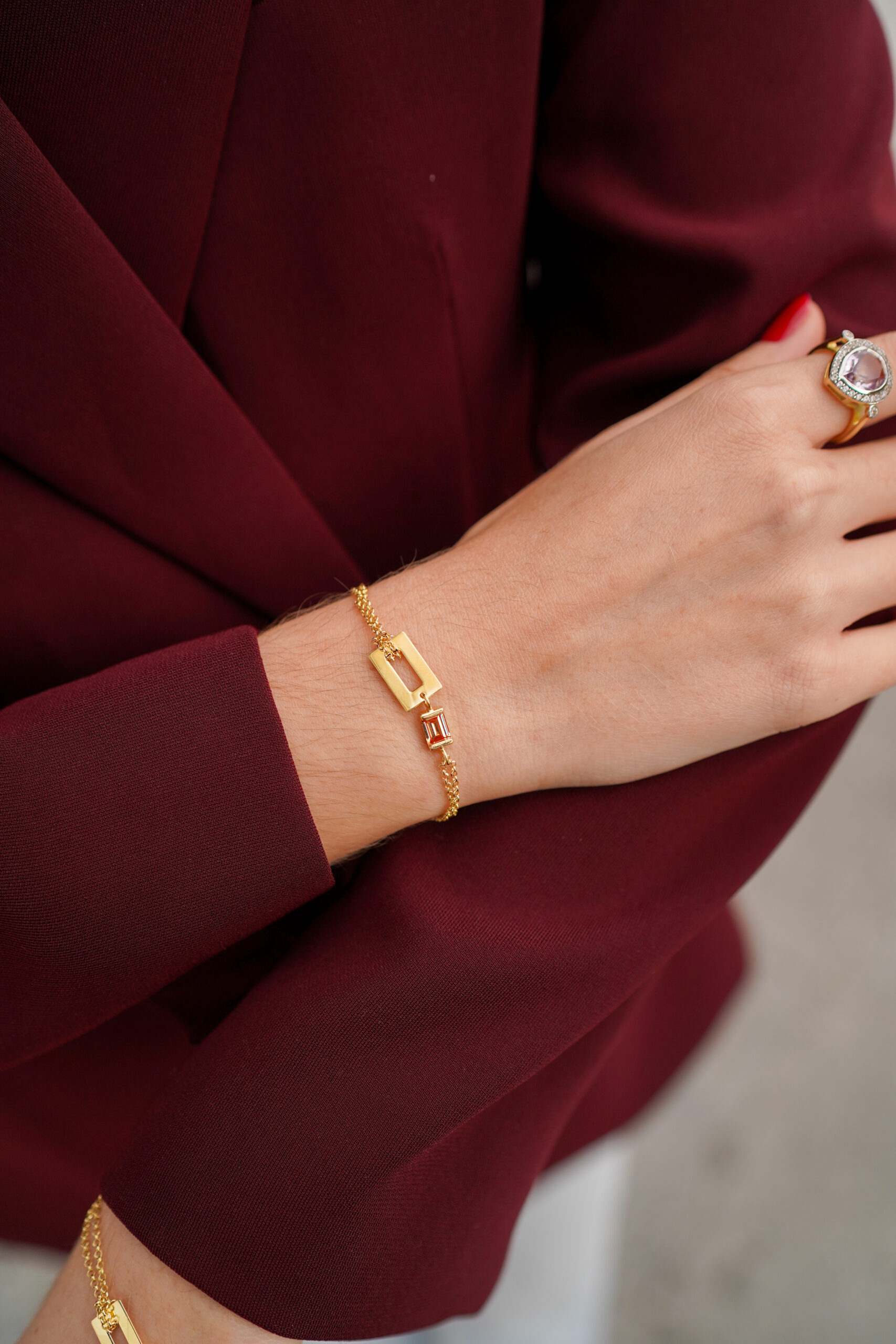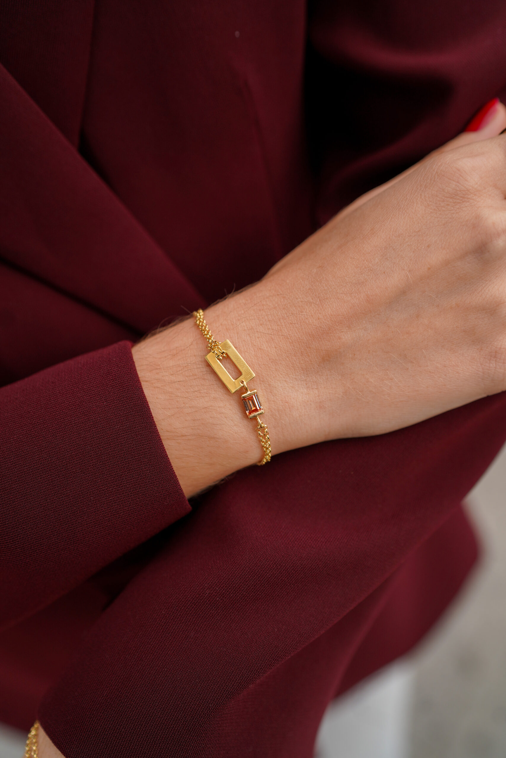 Pulsera en plata de ley chapada en oro con un diseño moderno y elegante, formada por una doble cadena fina que aporta un brillo delicado y contemporáneo. En el centro destaca una pieza geométrica rectangular combinada con una circonita baguette en tono champagne, creando un contraste sofisticado y actual.