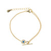 Pulsera en plata de ley chapada en oro con motivo en forma cuadrada con circonita rosa en el centro. Esta original pulsera posee, además del cierre trasero típico, un cierre delantero formado por una barra que pasa la cadena.