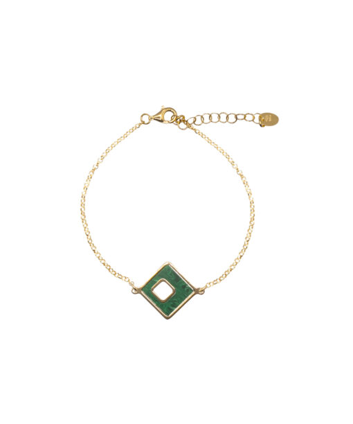 Pulsera en plata de ley chapado en oro con colgante en forma de cuadrado con malaquita en el interior y una parte calada.