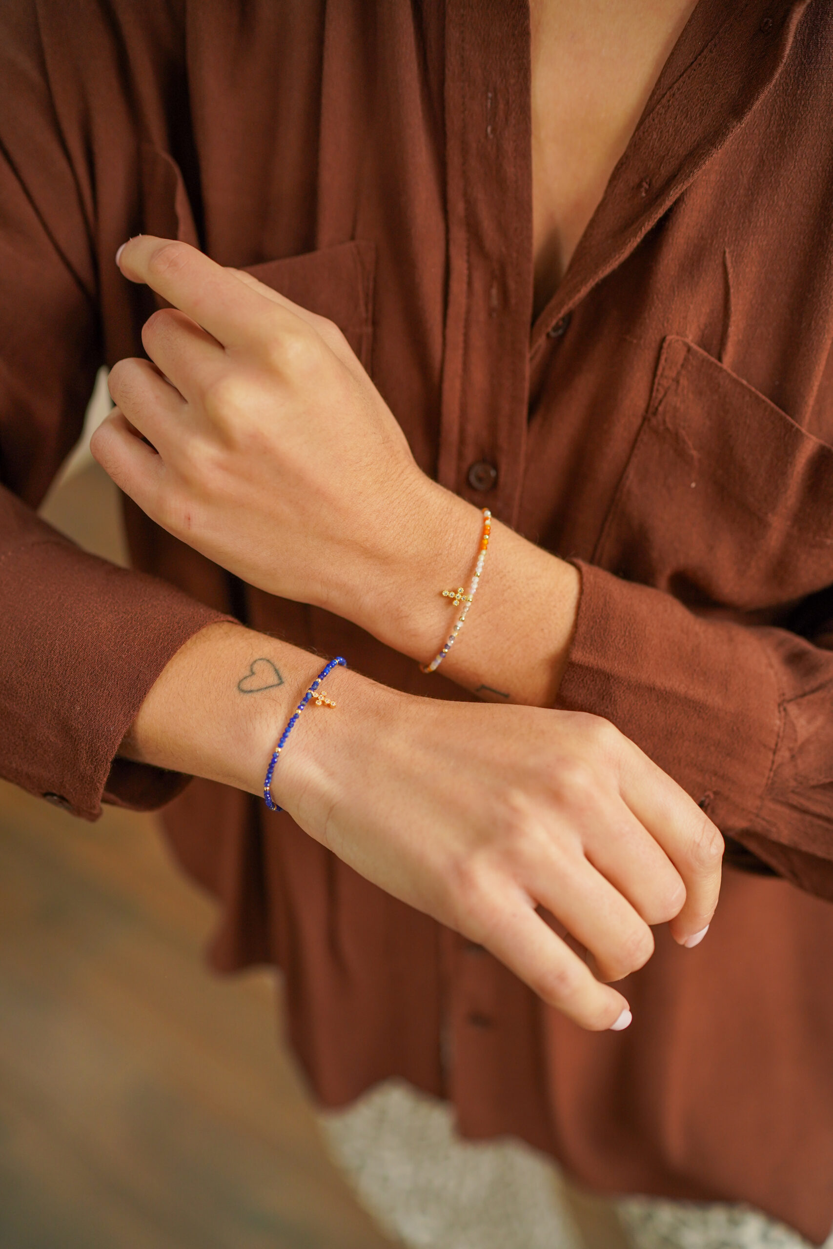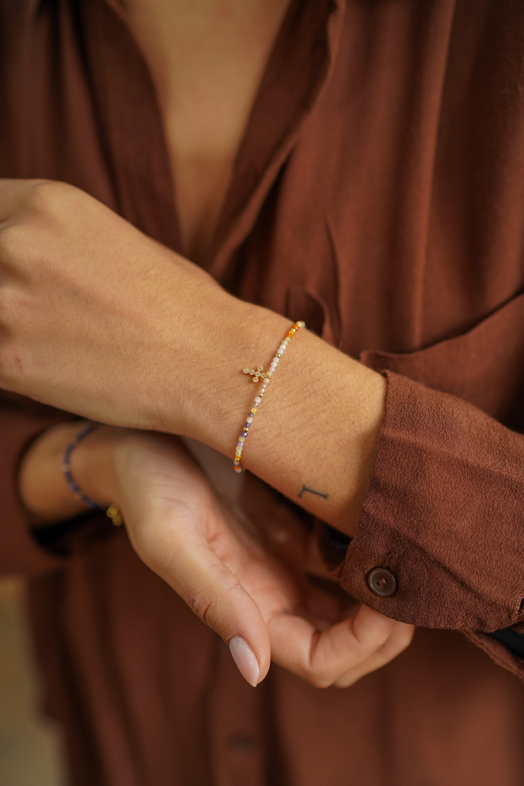 Pulsera en plata de ley chapada en oro con diseño delicado, formada por pequeñas cuentas facetadas de turmalina de colores que aportan luz y sutileza a la pieza. Entre ellas se intercalan diminutas bolitas doradas que realzan el conjunto, y en el centro destaca un charm de cruz con circonitas que añade un toque elegante y simbólico.