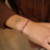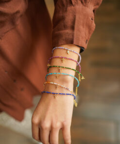 Pulsera en plata de ley chapada en oro con diseño delicado, formada por pequeñas cuentas facetadas de turquesas que aportan luz y sutileza a la pieza. Entre ellas se intercalan diminutas bolitas doradas que realzan el conjunto, y en el centro destaca un charm de cruz con circonitas que añade un toque elegante y simbólico.