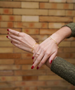 Pulsera en plata de ley chapado en oro con una cadena tipo eslabón alargado de líneas limpias y elegantes. Sobre ella se distribuyen delicadas circonitas cúbicas de corte cuadrado que aportan destellos sutiles y un aire refinado. Una pieza luminosa, moderna y fácil de combinar.