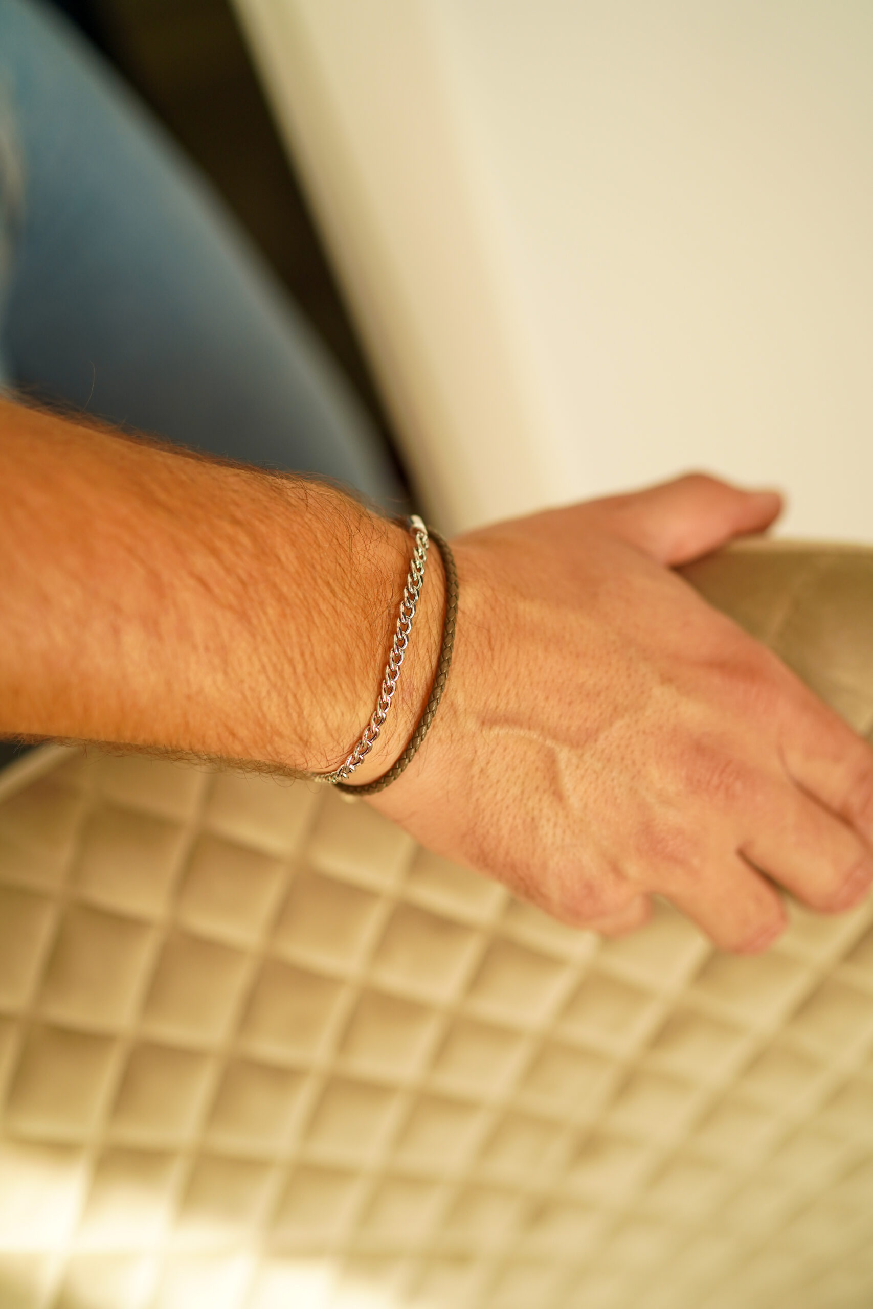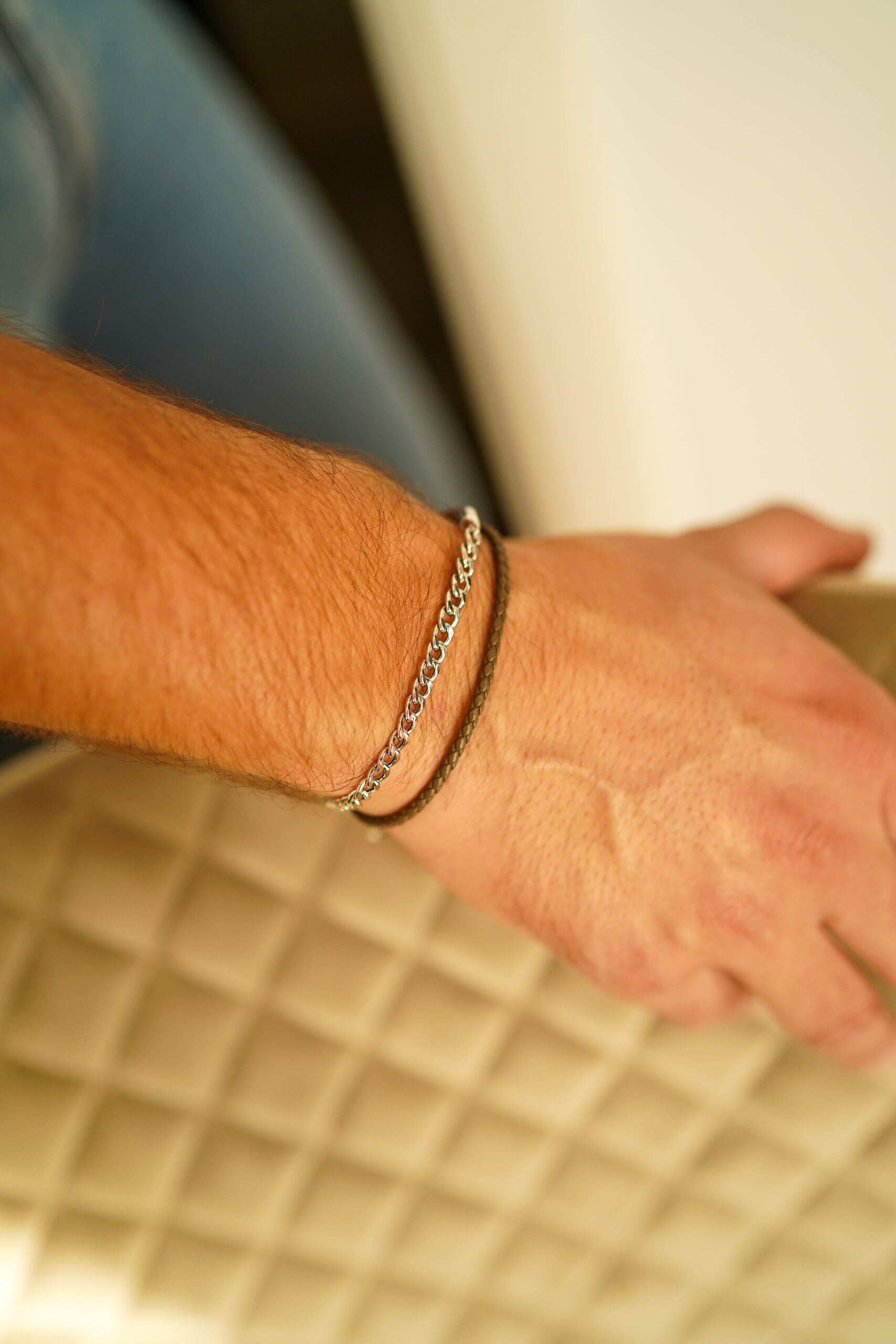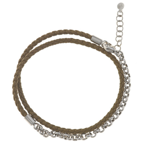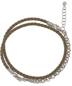 Pulsera doble de cadena rolo en plata de ley y cuero marrón.