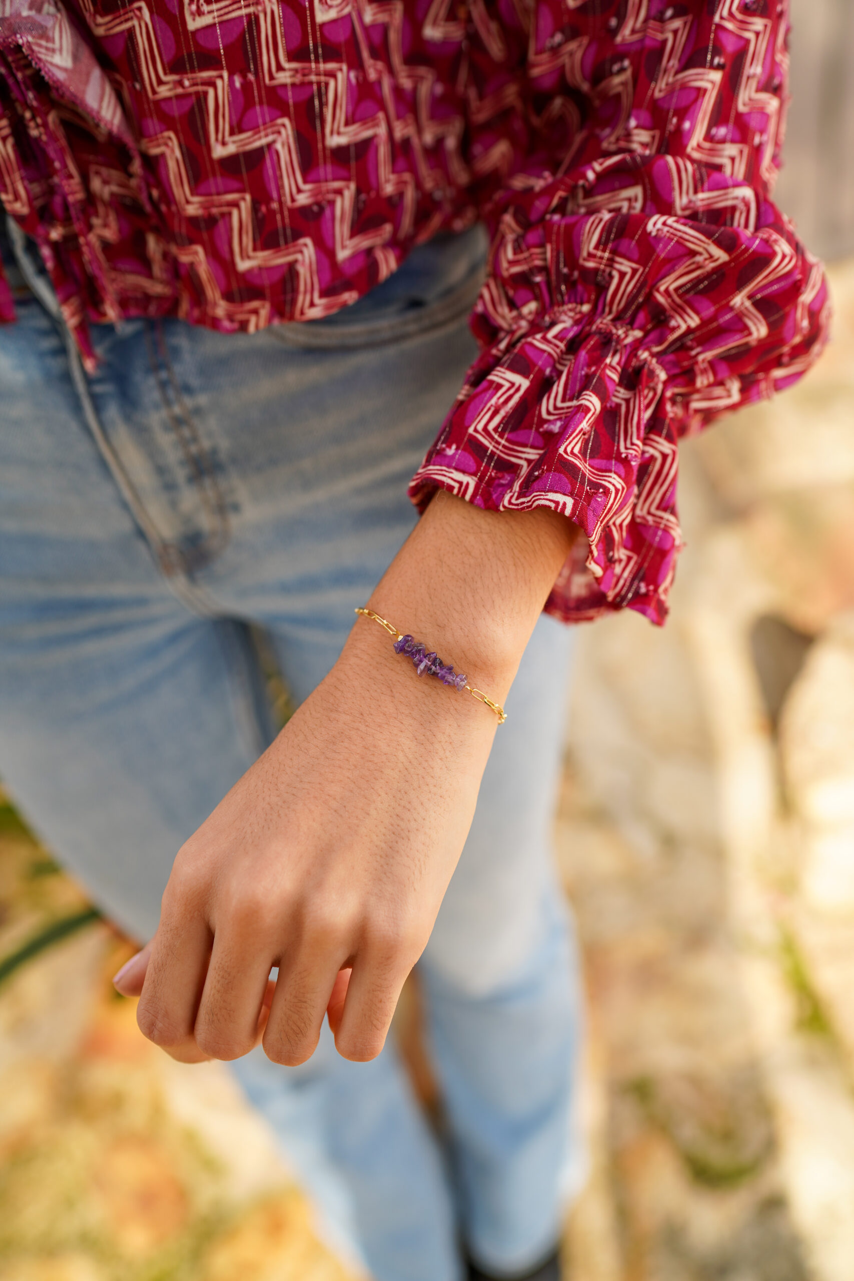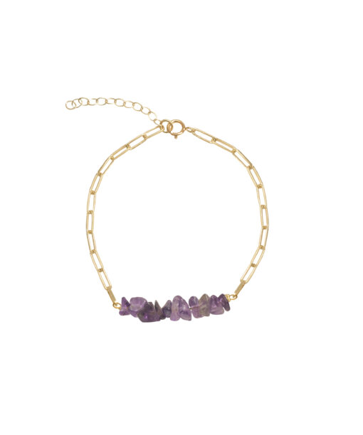 Pulsera en plata de ley chapada en oro con centro de piedras amatista irregulares y cadena de eslabones.