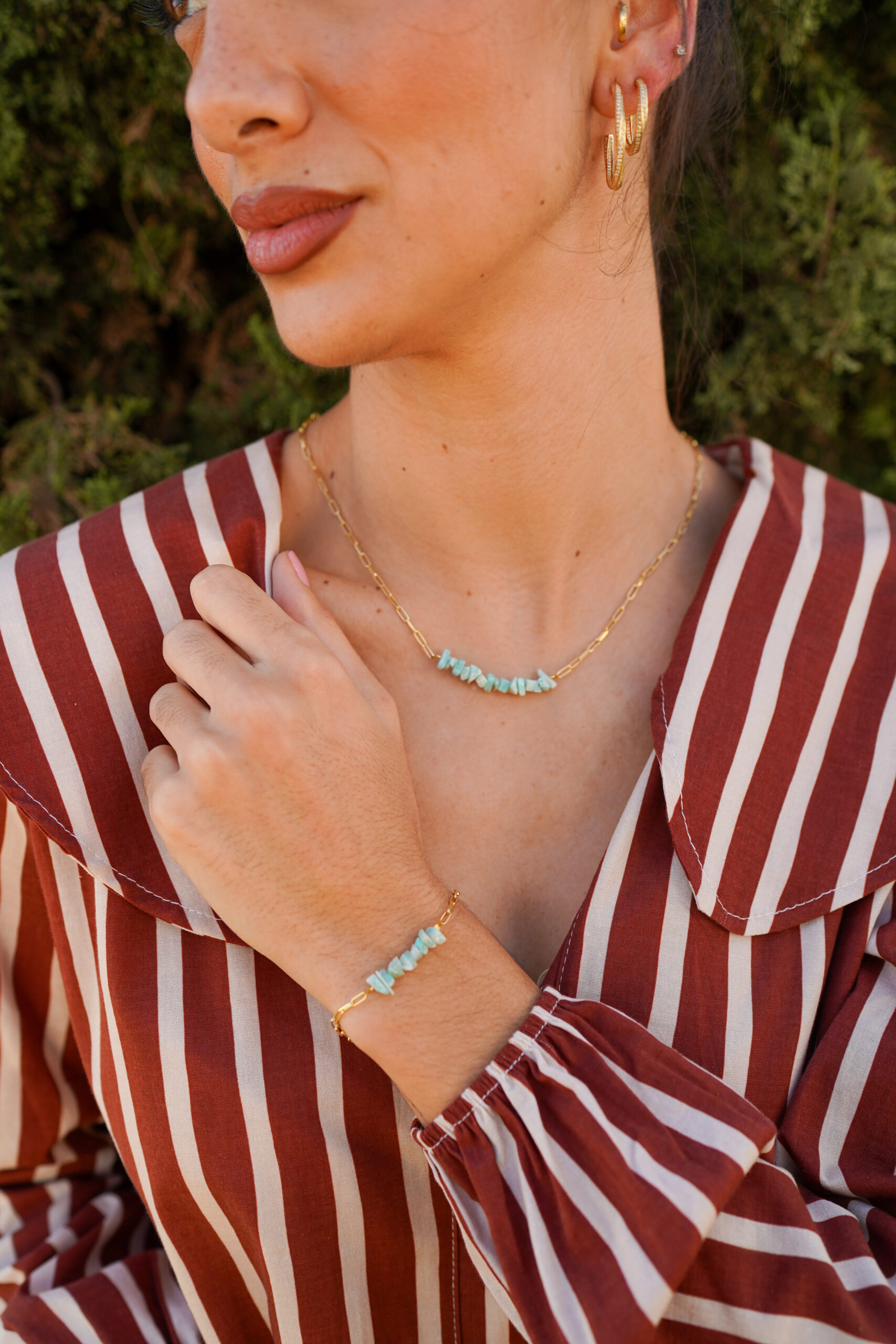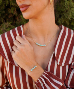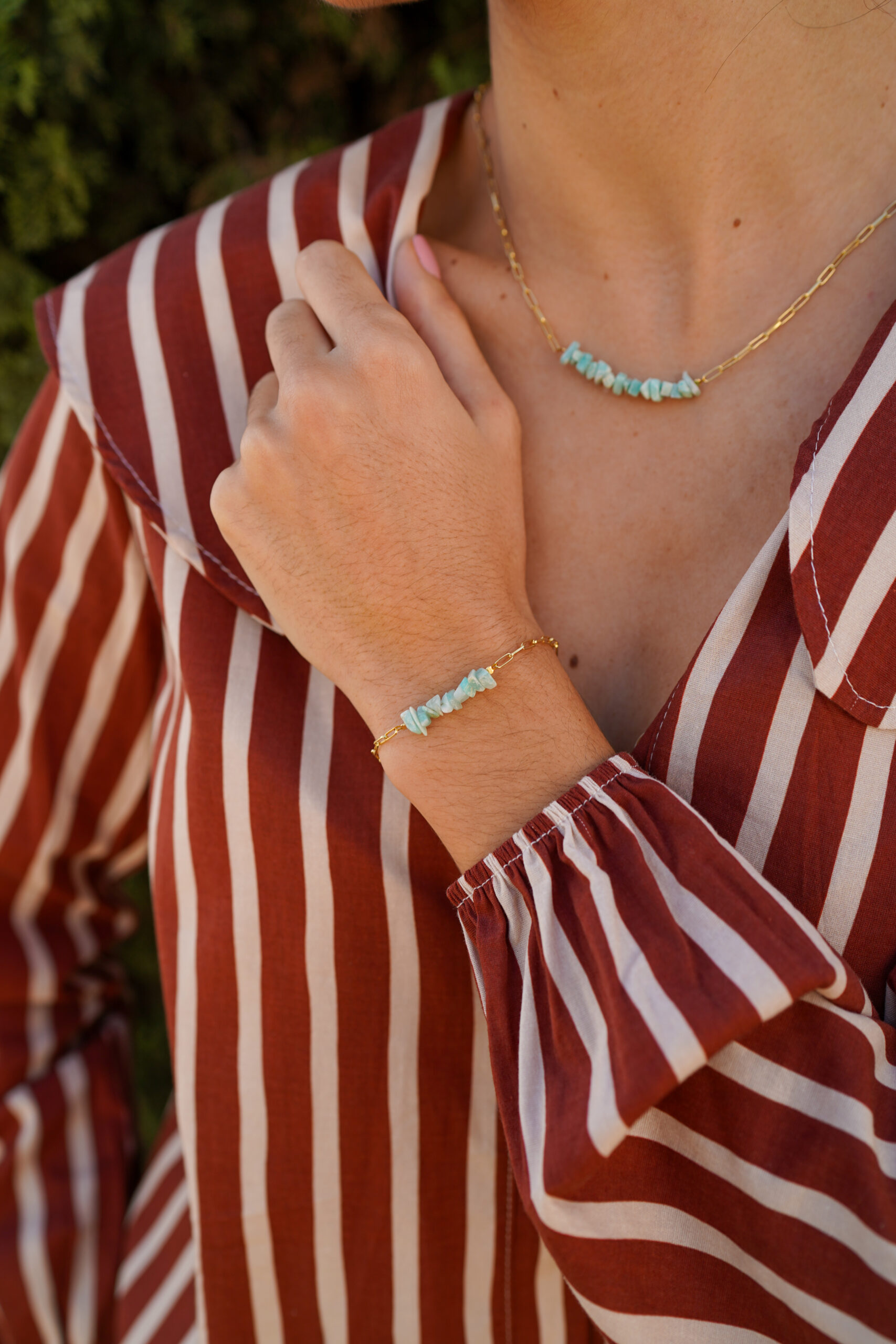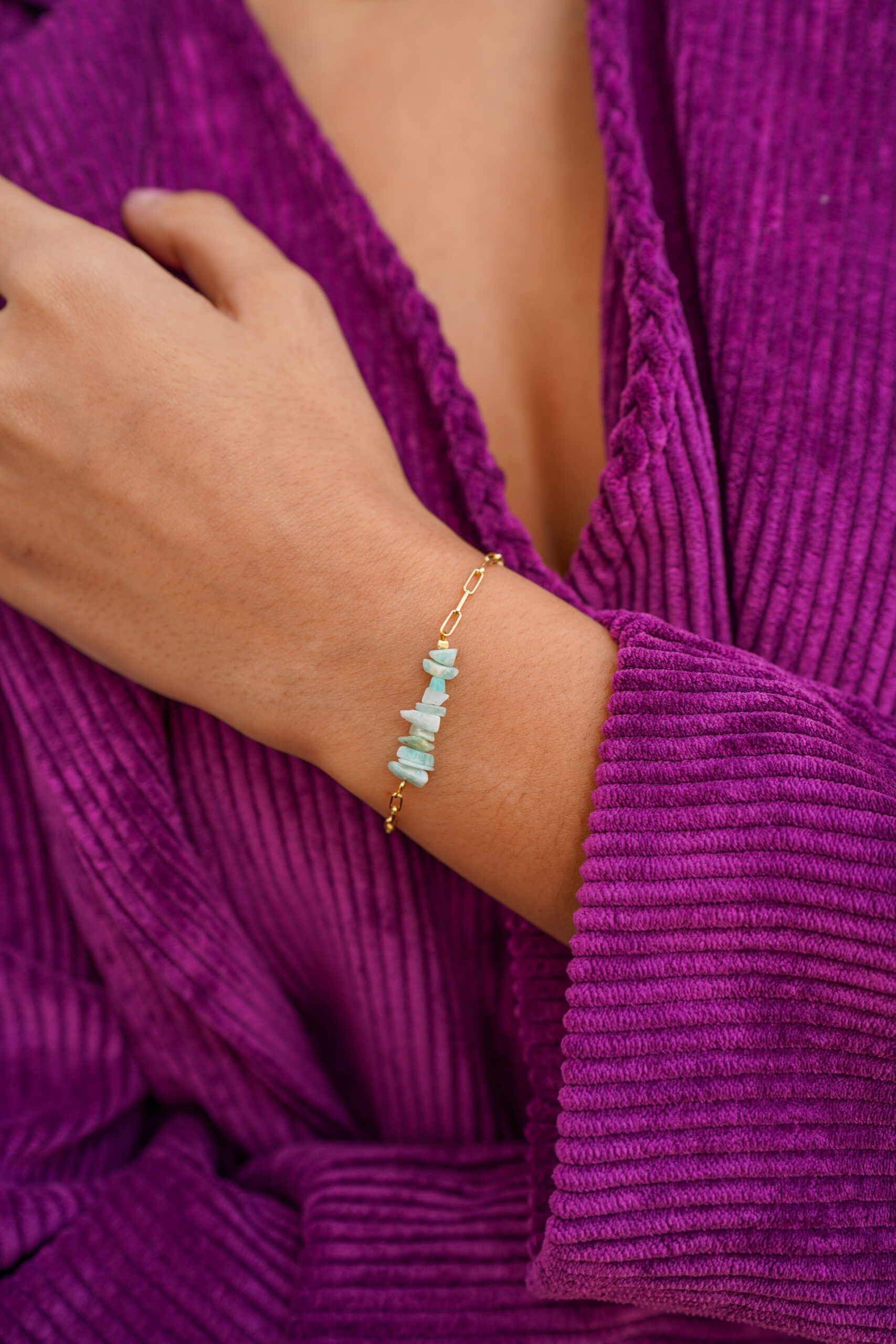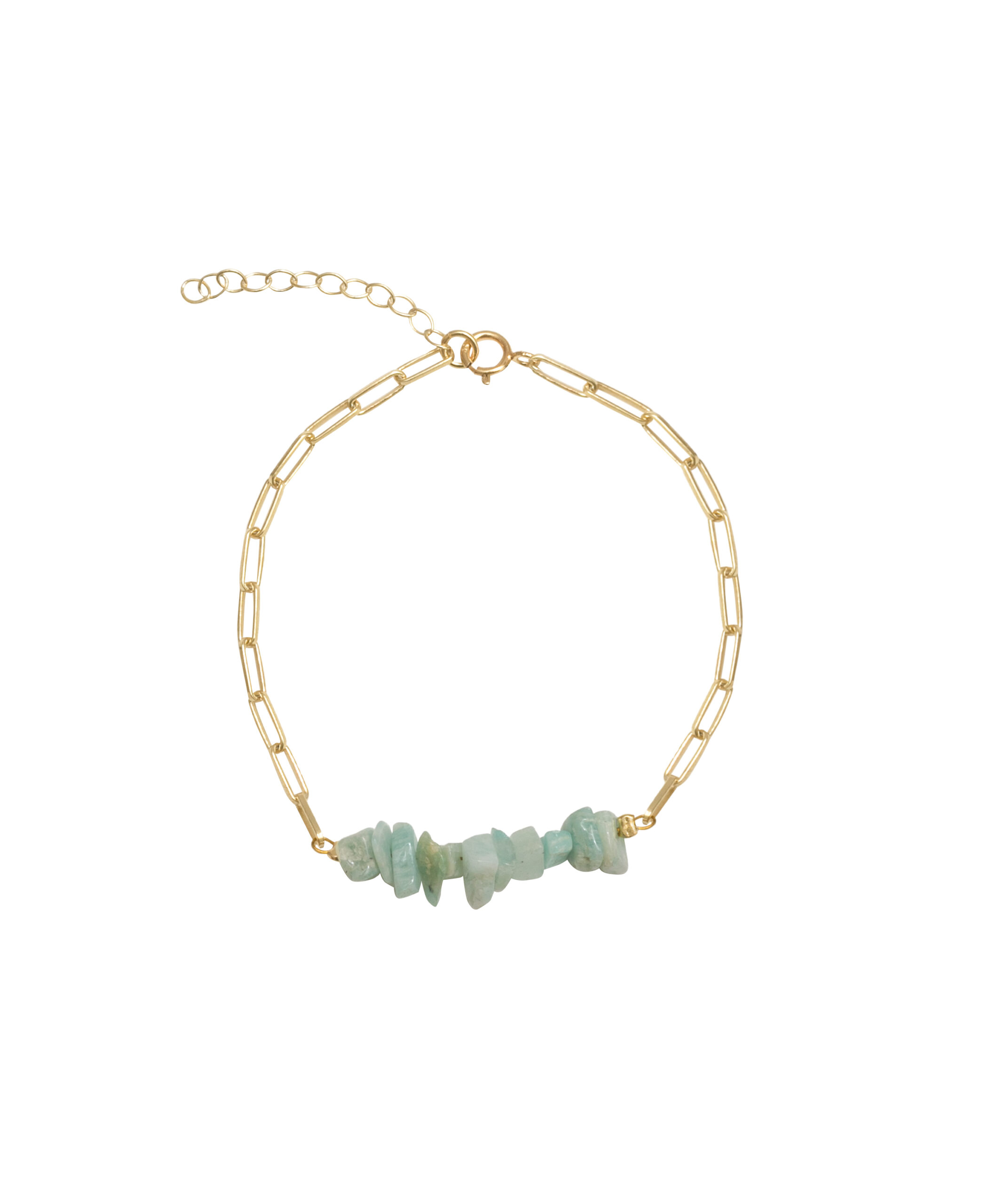 Pulsera en plata de ley chapada en oro con centro de piedras amazonita irregulares y cadena de eslabones.