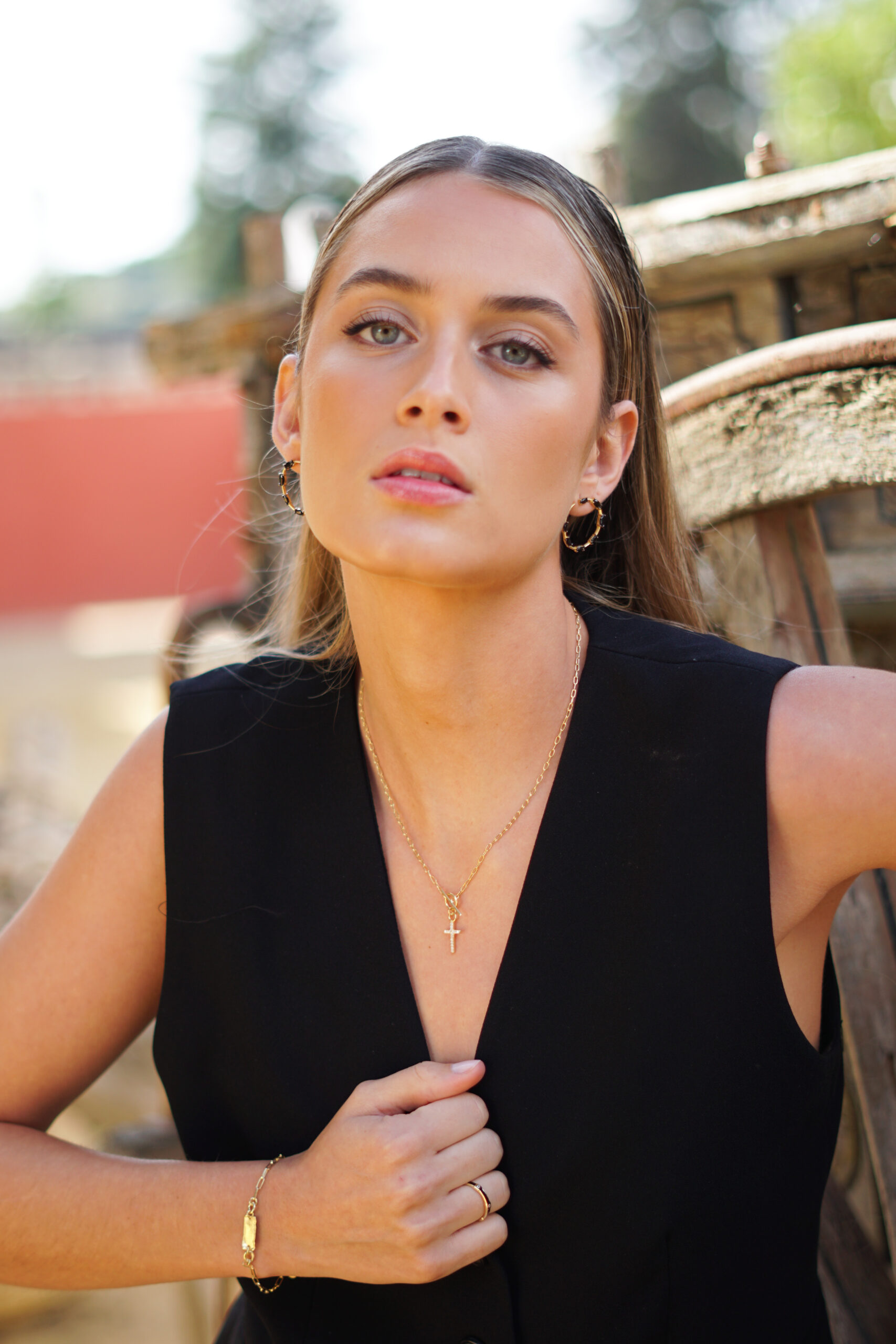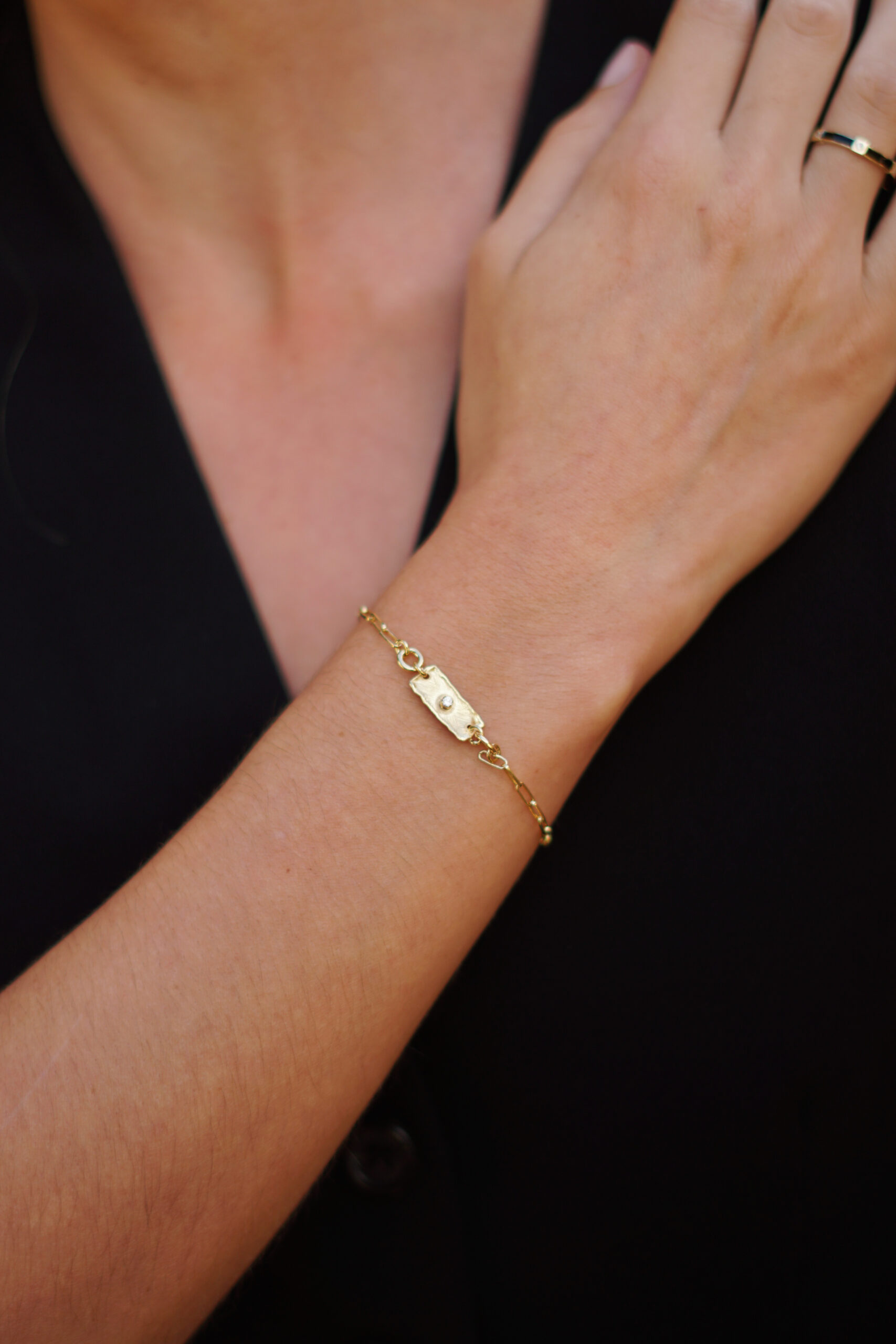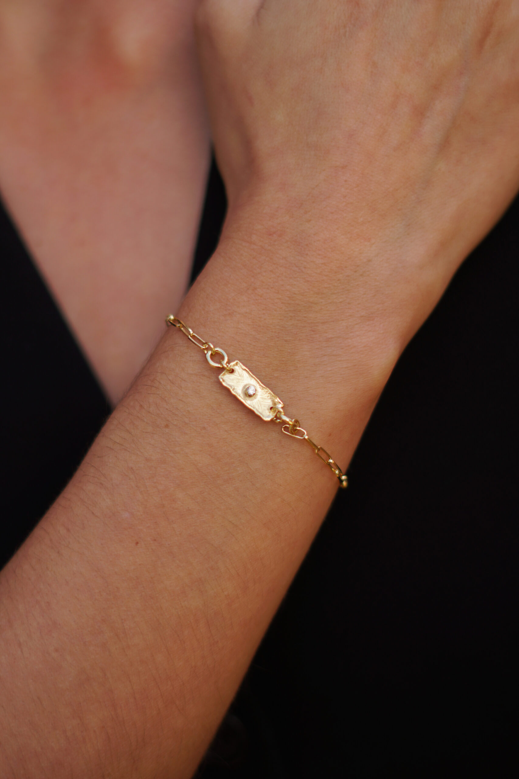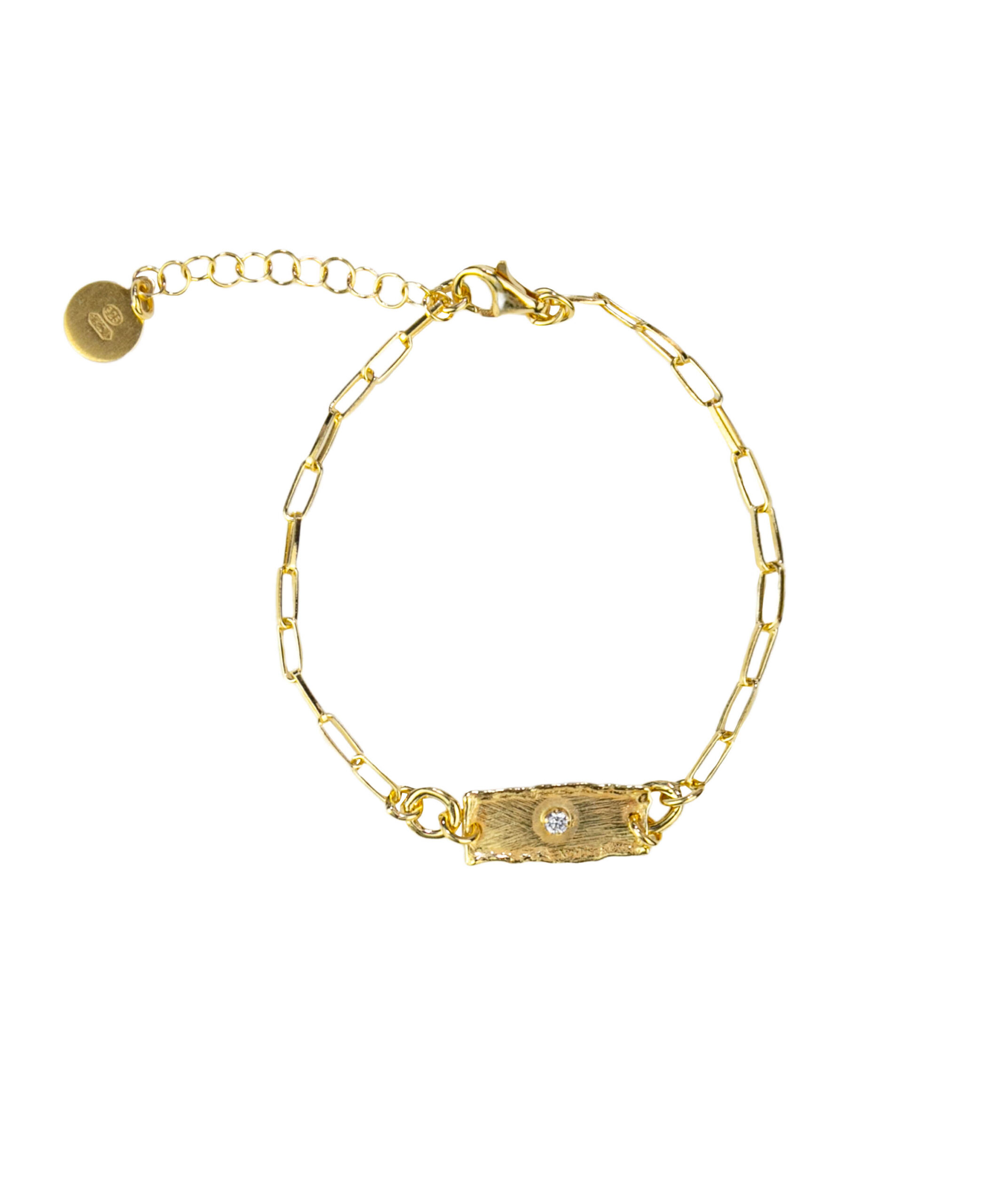 Pulsera de eslabones en plata de ley chapado en oro con motivo rectangular con circonita y matizado en el centro.