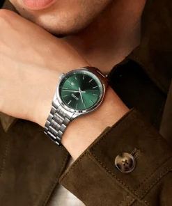 Descubre nuestra nueva colección de relojes para hombre: el epítome del estilo, la calidad y el lujo. Con diseños elegantes y una construcción duradera, estas piezas combinan sofisticación y modernidad. Con una caja de 41 mm de acero inoxidable plateado cepillado y pulido y una esfera verde con efecto rayos de sol, el ANTHÉOR se convertirá en el centro de atención de tu muñeca. Su correa plateada de acero inoxidable de 20 mm de ancho complementa a la perfección la caja, creando un diseño armonioso y elegante que combina sin esfuerzo con cualquier atuendo. Para ajustar la correa y cambiar la pila, te recomendamos que acudas a tu joyería.