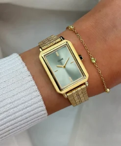 El reloj rectangular para mujer Fluette tiene una caja dorada de 30.6 mm, una esfera verde salvia y una correa dorada de acero inoxidable de 14 mm con 5 eslabones.