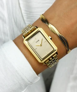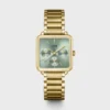 El reloj rectangular para mujer Fluette tiene una caja dorada de 30.6 mm, una esfera dorada de textura de arena y una correa dorada de acero inoxidable de 14 mm.