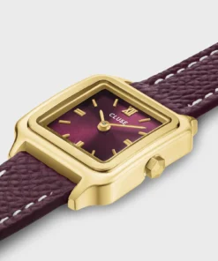 El reloj cuadrado Gracieuse Mini para mujer cuenta con una caja de color dorado de 21 mm, una esfera de color vino y una correa doble de piel de color vino de 12 mm con costuras blancas.