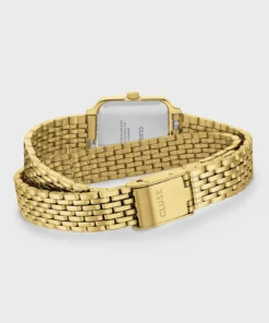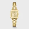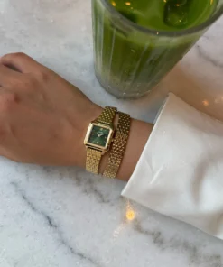 El reloj cuadrado Gracieuse Mini para mujer cuenta con una caja de color dorado de 21 mm, una esfera de color verde bosque y una correa doble de acero inoxidable de 12 mm de color dorado.