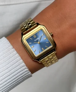 Añade un toque de color a tu look con el reloj Gracieuse para mujer en color azul cianita y dorado. Con una caja cuadrada de color dorado, correa de 5 eslabones de 16 mm y una esfera azul cianita con corona a juego.