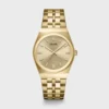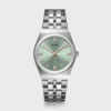 El reloj redondo Retro 70’s para mujer tiene una caja plateada de 33 mm, una esfera azul claro de aspecto vintage con agujas doradas y una correa de acero inoxidable de 5 eslabones de 20 mm plateada.
