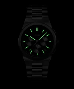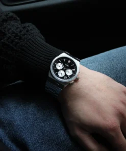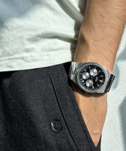 Masculino y multifuncional. Este sofisticado reloj Vigoureux Chrono para hombre tiene una correa integrada de acero inoxidable plateado de 24 mm, caja plateada cepillada y pulida de 40 mm y una esfera negra con tres subesferas plateadas y taquímetro plateado. Un reloj deportivo de extraordinaria calidad, atractivo visual y un tema de conversación por excelencia.
