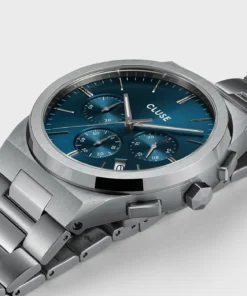 Masculino y multifuncional. Nuestro reloj para hombre más sofisticado hasta la fecha: el CLUSE Vigoureux Chronograph. Este reloj Vigoureux Chronograph para hombre tiene una correa integrada de acero inoxidable plateado de 24 mm, caja plateada cepillada y pulida de 40 mm y esfera azul petróleo de rayos de sol con tres subesferas con detalles rojos. Un reloj deportivo de extraordinaria calidad, atractivo visual y un tema de conversación por excelencia. Para ajustar la correa y cambiar la pila, te recomendamos que acudas a tu joyería.
